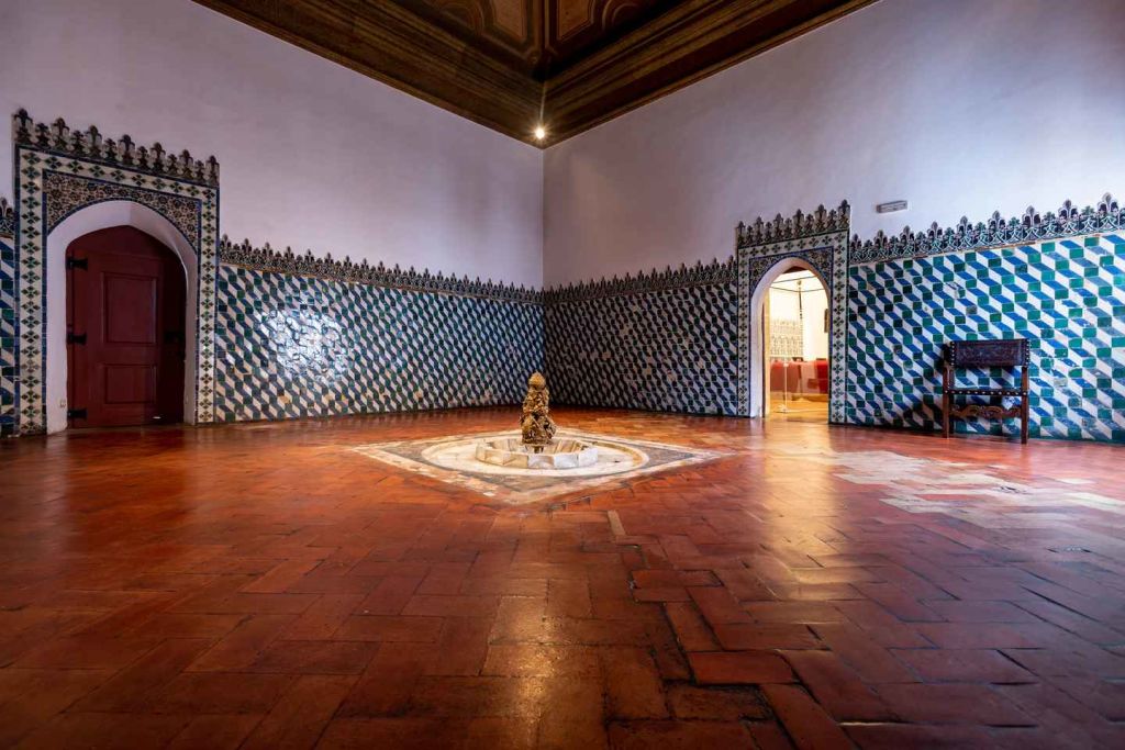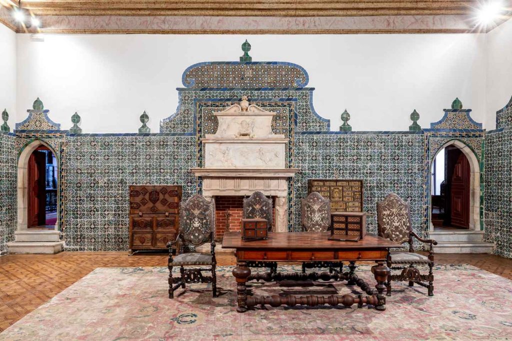 후속 확장 공사가 자연 경관을 어떻게 활용했는지 감탄하며, 내부 정원의 마누엘 양식과 무데하르 양식 디자인을 감상하고, 아치형 창문과 기하학적 패턴의 유리 타일로 장식된 벽을 발견하세요. 신트라 국립 궁전의 새로운 몰입형 경험: