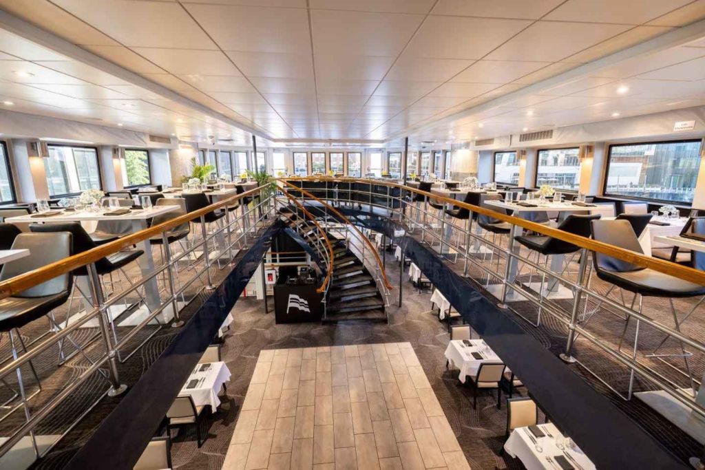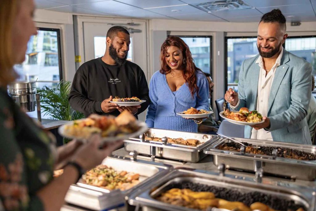 승무원의 환영을 받으며 개인 테이블로 이동하여 매일 신선하게 준비되는 창의적인 셀렉션으로 구성된 점심 또는 저녁 뷔페를 즐기세요. 라이브 DJ의 멋진 음악, 춤, 게임, 탁 트인 도시 전망으로 축제 분위기가 한층 더 고조됩니다.