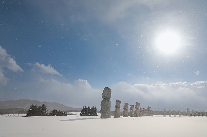 타키노 레이엔은 겨울이 되면 한층 더 신비로운 분위기를 자아내는 관광 명소입니다. 공원 곳곳에 늘어선 거대한 모아이상은 눈으로 덮이며 더욱 이국적이고 몽환적인 풍경을 연출해, 마치 다른 세계에 들어온 듯한 특별한 경험을 선사합니다.