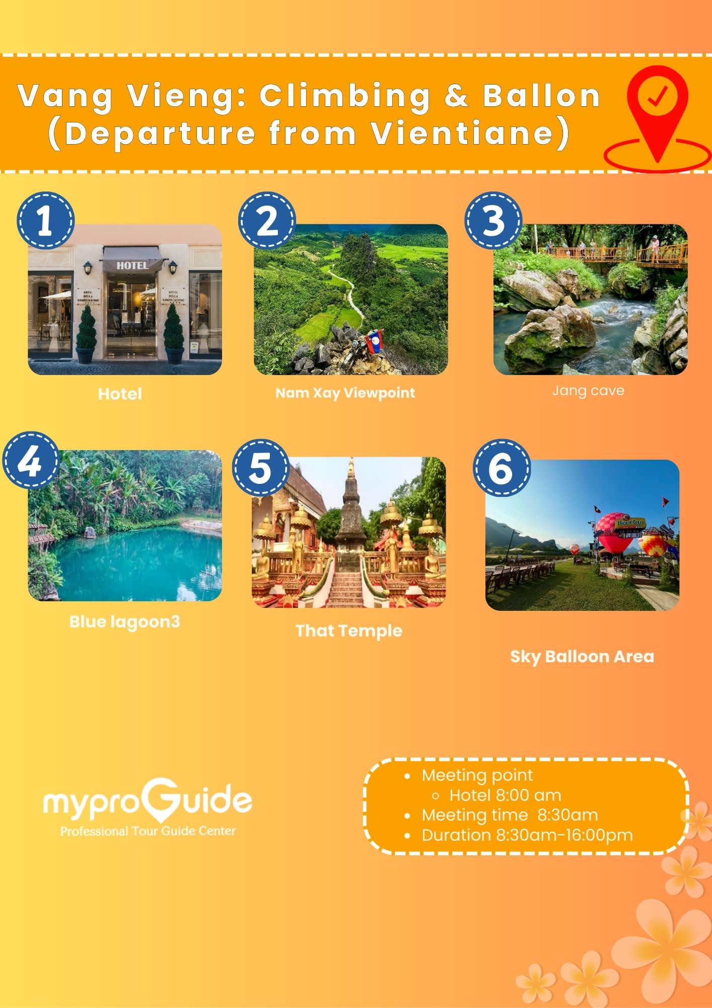 비엔티안에서 편안하게 호텔 픽업으로 하루를 시작해 아름다운 방비엥으로 떠나보세요. 먼저 남싸이 전망대를 방문해 울창한 풍경을 감상하며 모험을 시작합니다. 역사와 자연의 아름다움이 가득한 흥미로운 짱 동굴을 탐험해보세요. 맛있는 점심 식사로 에너지를 충전한 후에는 블루 라군 1에서 시원한 물놀이를 즐길 수 있습니다. 왓 탐푸캄에서 고요함과 문화를 느껴보세요. 마지막으로, 마법 같은 열기구에 탑승하여 그림 같은 방비엥의 풍경 위로 날아오르며 하루를 마무리하세요. 잊지 못할 탐험과 모험으로 가득한 하루를 보낸 후 편안하게 비엔티안으로 돌아갑니다.