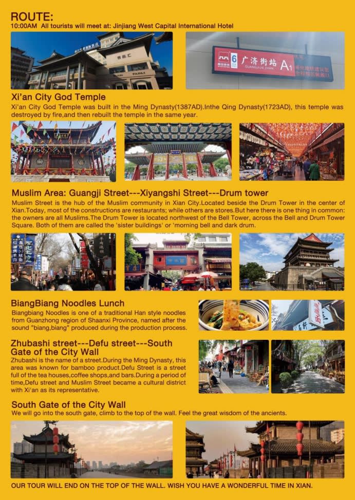 * 무슬림 거리: 광지제(Guangji Street) – 시양제(Xiyang Street) – 고루(Gulou) 거리를 거닐며 무슬림 문화를 느끼고 현지 간식을 맛보며 고루를 관람합니다.