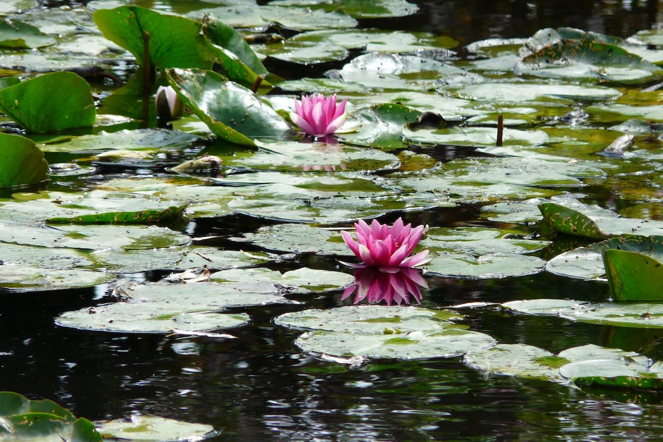 장미와 금련화로 장식된 중앙 통로를 따라 거닐며 튤립, 아이리스, 수선화, 작약의 다채로운 화단을 감상하세요. 아시아 식물과 상징적인 수련 연못, 유명한 녹색 일본식 다리로 이어지는 매혹적인 클로 노르망을 발견해 보세요.