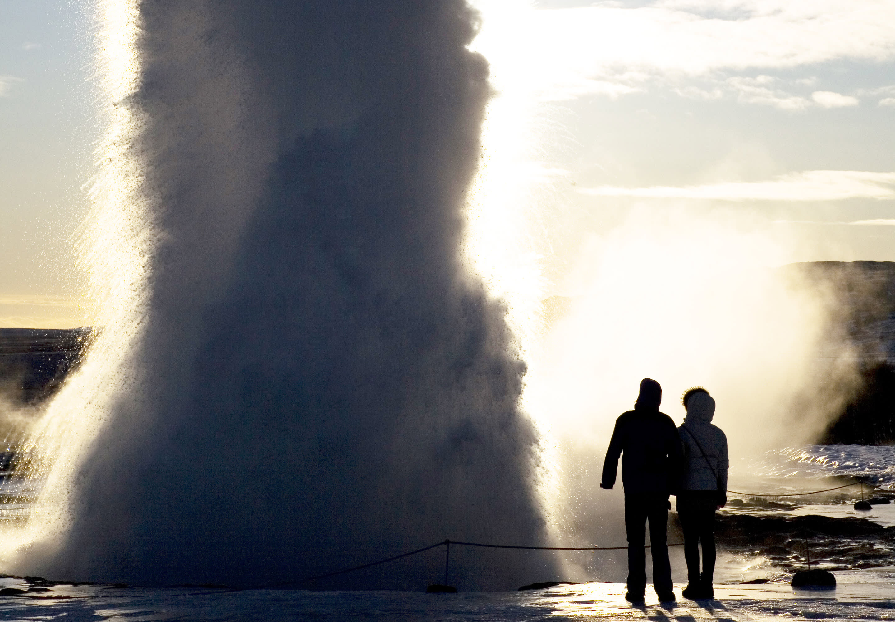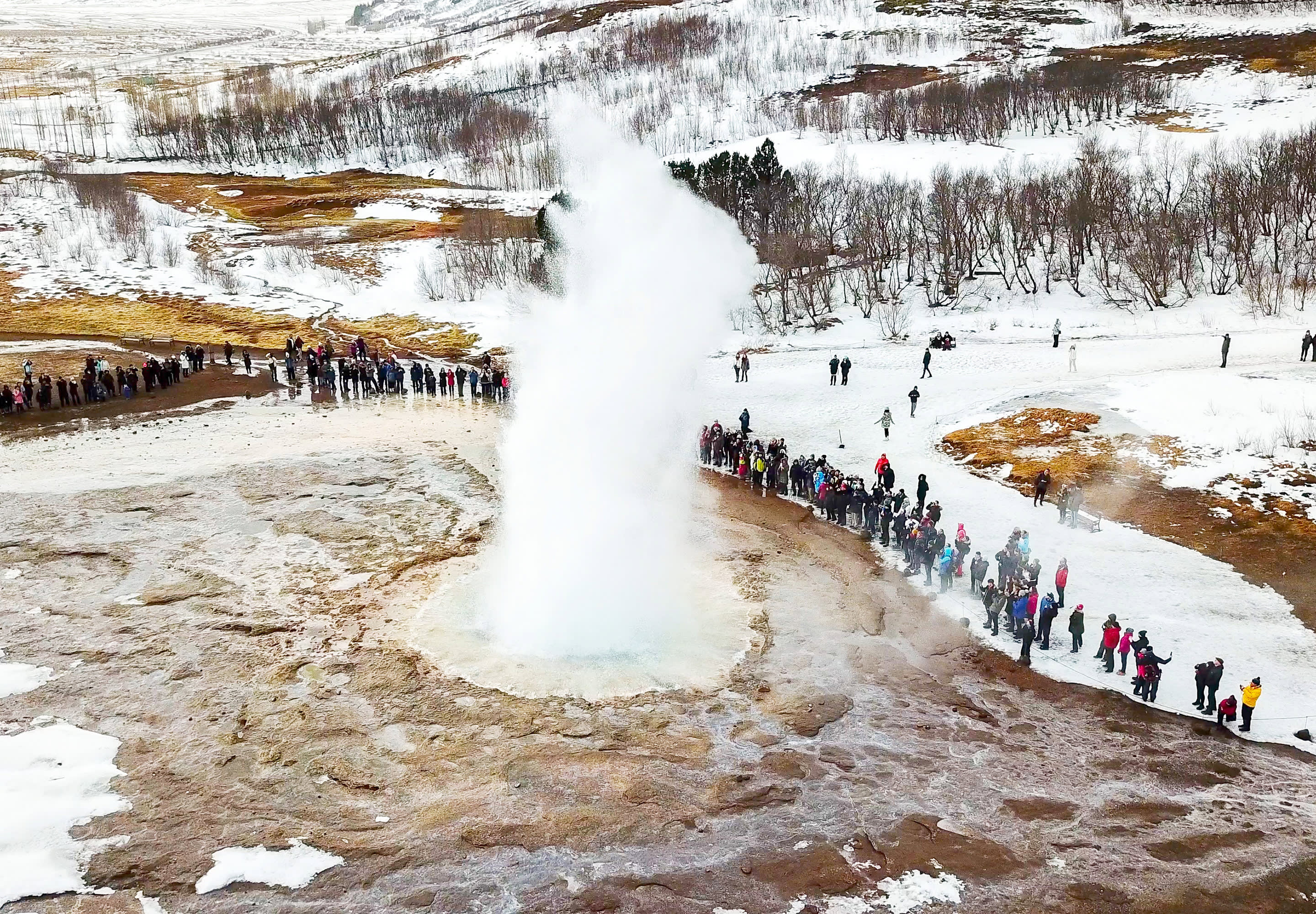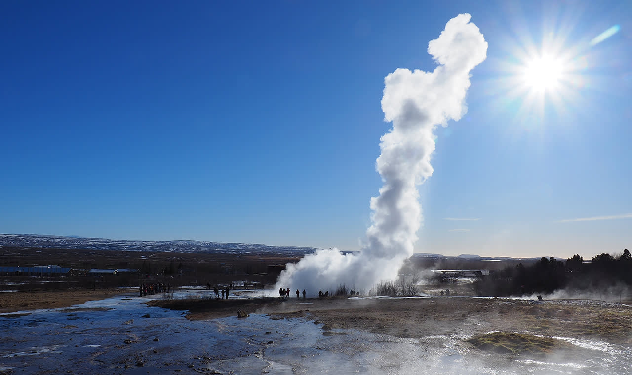 Geysir 지열 지대는 원래 간헐천인 Geysir의 이름을 따서 명명되었지만 지금은 더 이상 활동하지 않습니다. 이곳은 증기 구멍, 부글거리는 진흙탕, 다채로운 연못으로 가득 차 있으며, 가장 매력적인 것은 활동적인 Strokkur 간헐천으로 5~10분마다 한 번씩 분출하며 물줄기가 최대 20m까지 솟아오릅니다.