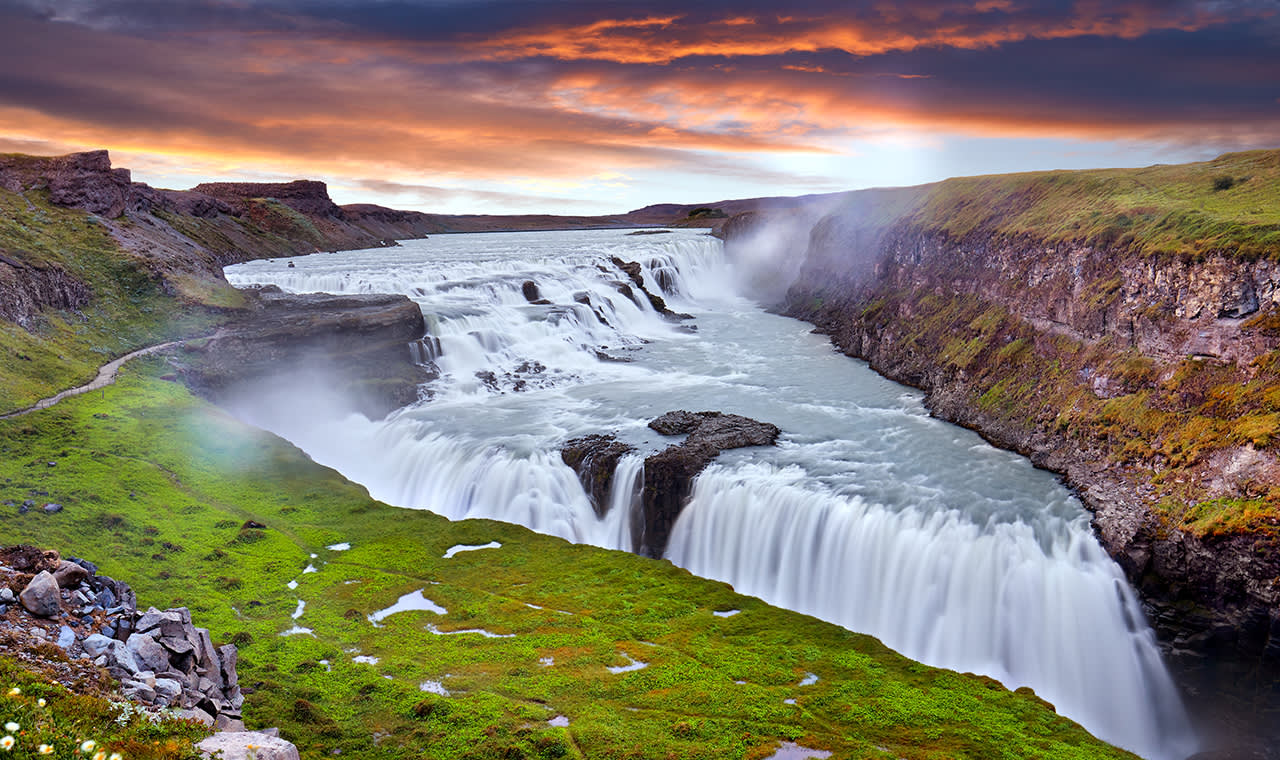 굴포스 폭포라고도 알려진 황금 폭포는 골든 서클에서 꼭 방문해야 할 명소입니다. 아이슬란드에서 두 번째로 큰 빙하인 Langjökull에서 흘러나옵니다. 폭포는 먼저 36m의 완만한 경사면에서 쏟아져 내린 다음 68m의 절벽에서 빠르게 떨어져 장엄한 폭포와 아름다운 물보라를 형성하며 햇빛 아래에서 거대한 무지개를 반사합니다.