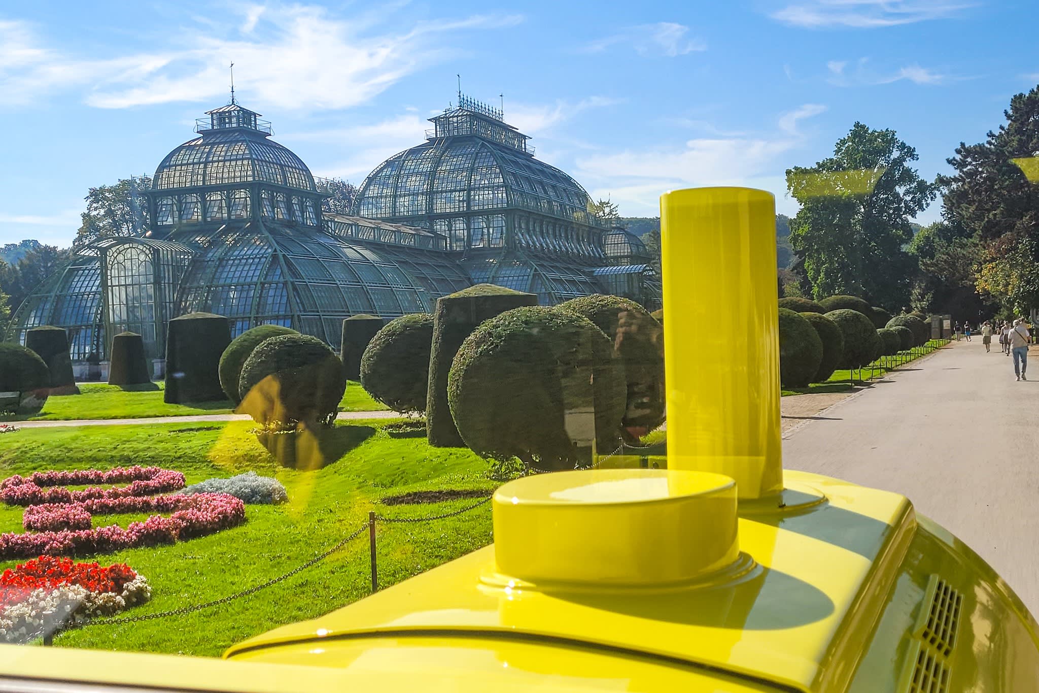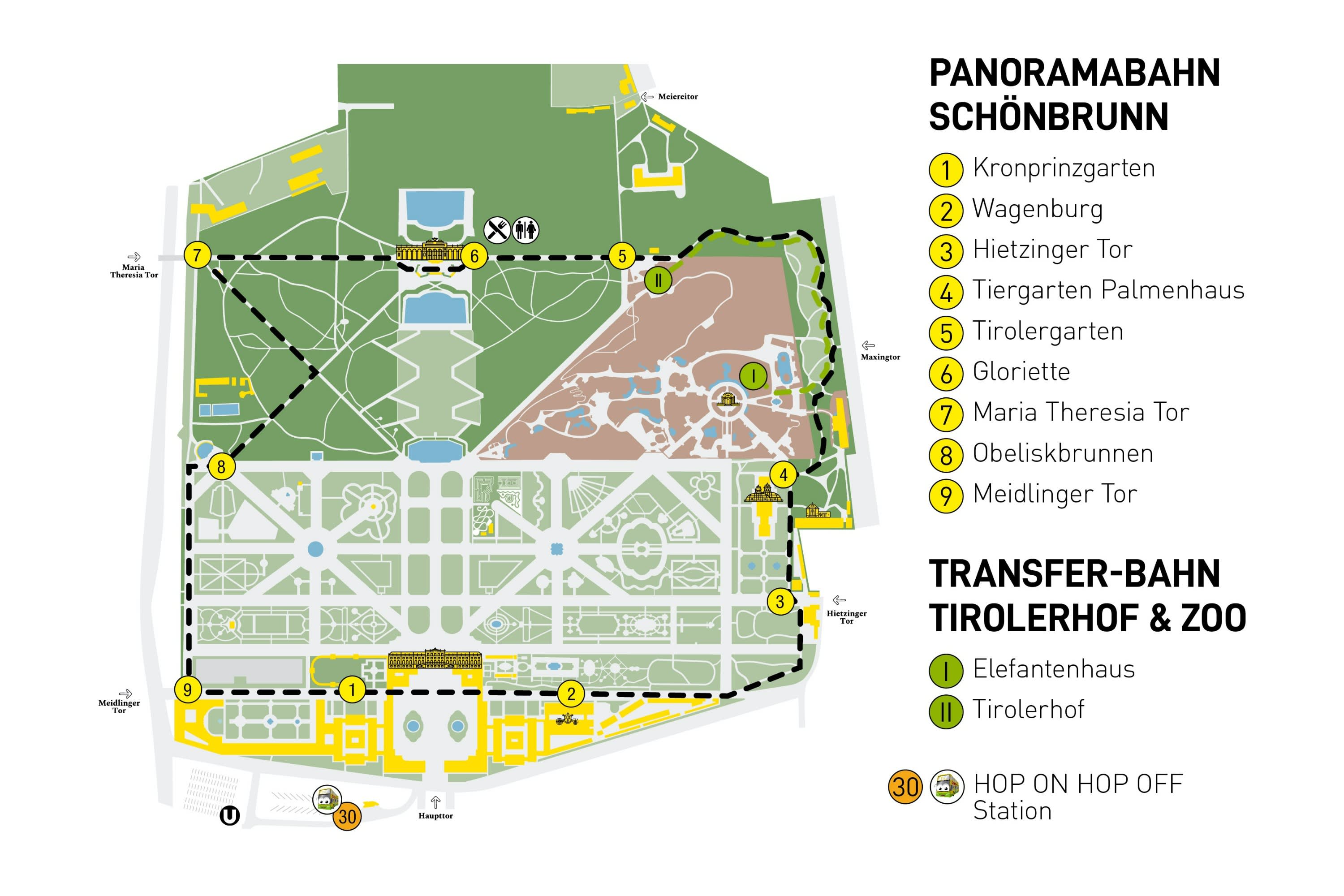 쇤브룬의 주요 명소를 편안하게 둘러볼 수 있는 새로운 쇤브룬 파노라마 기차를 만나보세요! Vienna Sightseeing의 옐로우 Hop-On-Hop-Off 노선을 이용하면 도심에서 화려한 글로리에테까지 빠르게 이동할 수 있습니다. 합스부르크 왕가의 여름 별궁이었던 이곳에서 쇤브룬 파노라마 기차로 갈아타고 웅장한 공원 지역을 탐험해 보세요.