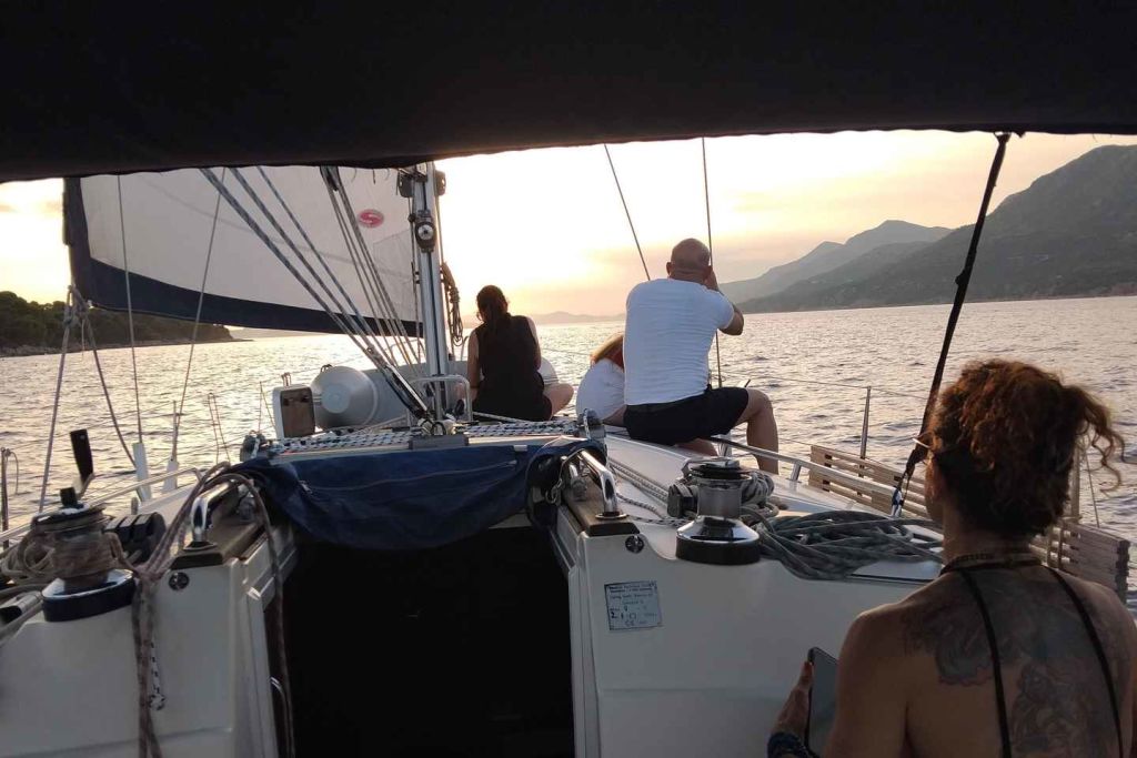 중세 성곽 옆을 항해할 수 있는 특별한 기회입니다. 이곳은 영화 왕좌의 게임이 촬영된 곳입니다. 또는 숨겨진 만에서 엘라피티 섬 옆의 탁 트인 바다를 항해하며 일몰을 기다릴 수도 있습니다. 이곳에서는 절벽의 새들만 지저귀는 소리만 들을 수 있습니다.