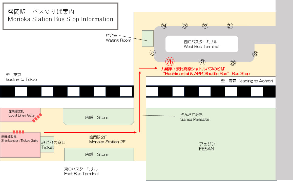 ▶[하치만타이 리조트] 스키 & 스노보드 세트권 * 2025 모리오카역 서쪽 출구 셔틀 승강장 2025 모리오카역 서쪽 출구 셔틀 승강장 * 모리오카역 동쪽 출구 버스 안내소 & 하치만타이 방면 승차장 모리오카역 동쪽 출구 버스 안내소 & 하치만타이 방면 승차장