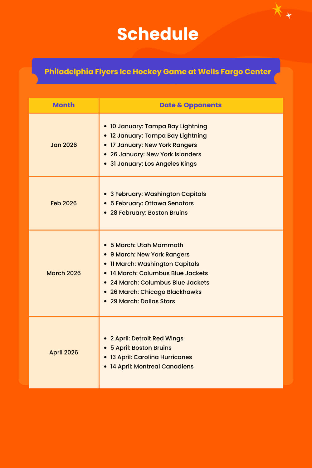 상징적인 웰스 파고 센터에서 필라델피아 플라이어스 경기를 관람하며 라이브 아이스하키의 스릴을 경험해 보세요. 열정적인 팬들이 경기장을 가득 채우고 NHL에서 가장 유서 깊은 프랜차이즈 중 하나를 응원하는 짜릿한 분위기를 느껴보세요. 엘리트 선수들이 얼음 위에서 속도, 기술, 강렬한 액션을 선보이며 처음 관람하는 사람들과 열렬한 팬 모두에게 잊을 수 없는 스포츠 경험을 선사합니다. 현대적인 경기장은 훌륭한 시야, 최첨단 시설, 그리고 다양한 음식과 음료를 제공하여 경기 관람의 밤을 더욱 즐겁게 해줍니다. 필라델피아를 방문하는 여행객이든 현지 스포츠 애호가이든, 플라이어스 경기는 빠르게 진행되는 흥분, 팀 정신, 그리고 미국 프로 하키의 진정한 맛을 선사할 것입니다.