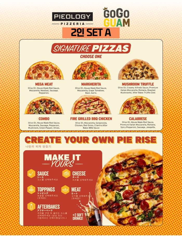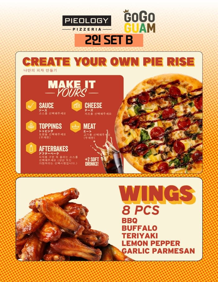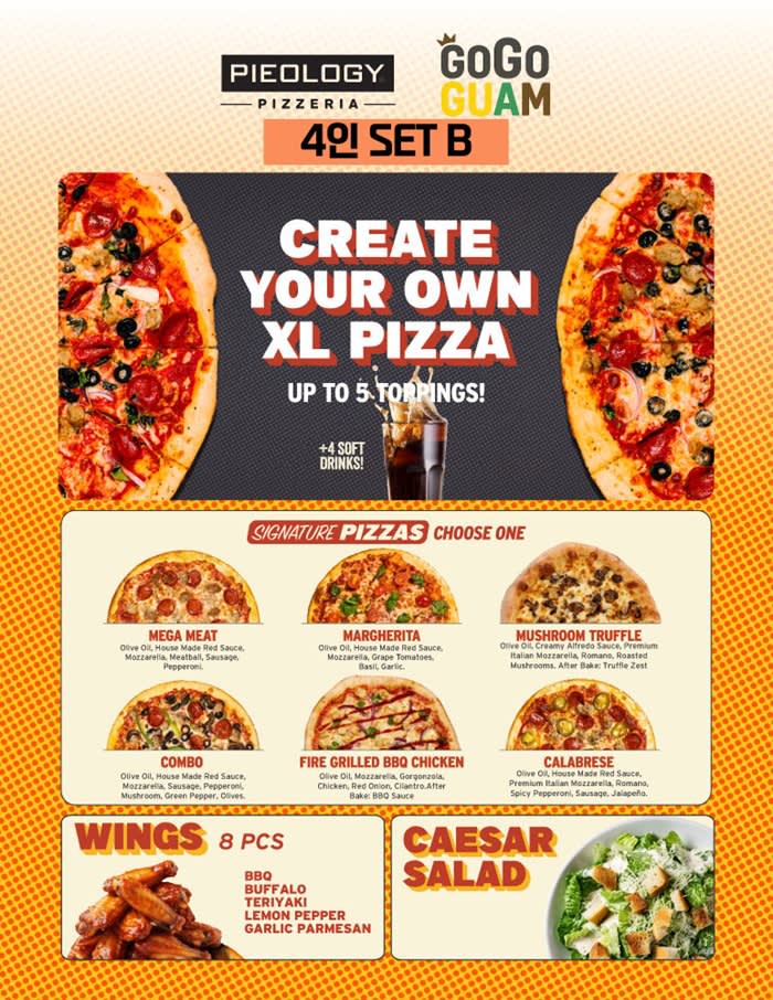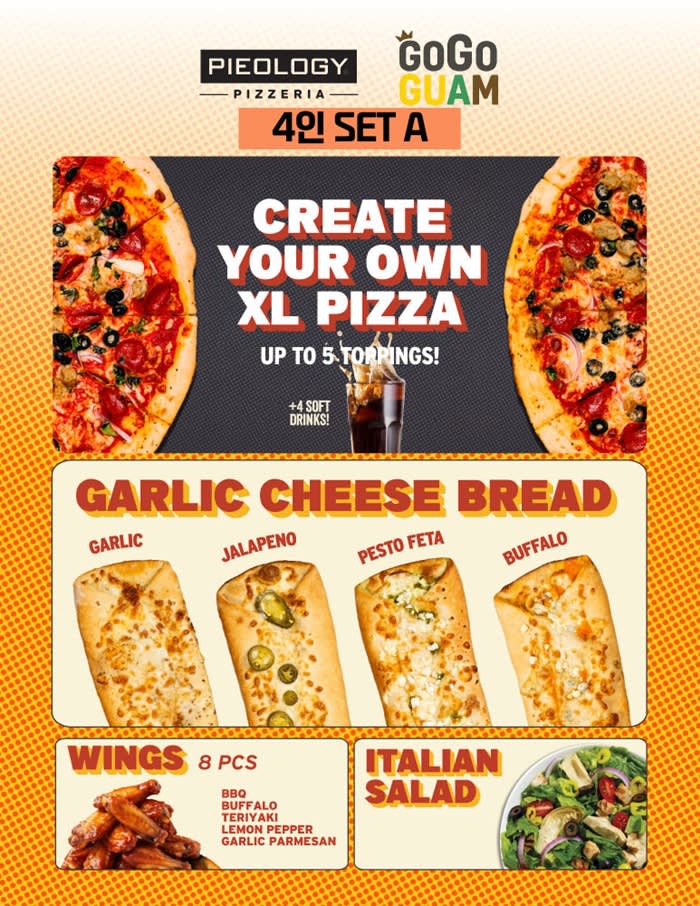 ⚠️ 이용 시 유의사항 ⚠️ - 원활한 이용을 위해 예약시간 10분 전 도착해 주세요. - 예약한 시간보다 늦어지면 자리 배정이 늦어질 수 있습니다. - 레스토랑 이용시간: 11:00 ~ 21:00 (라스트 입장 : 20:00) 🙋♀️ 이용 전 꼭 확인해 주세요! - 예약은 인원수가 아닌 세트메뉴 수량 기준으로 진행해 주세요. (예: 2인 세트 이용 시, 2명이 함께 1세트 구매) - 이용 시에는 예약확정서(바우처) 인쇄본을 반드시 지참해 주셔야 합니다. 모바일 화면 제시 시 이용이 불가하니 꼭 인쇄해 오시기 바랍니다. - 본 상품은 픽업 및 드랍 서비스가 포함되지 않으며, 레스토랑까지는 개별적으로 이동해 주셔야 합니다. - 주소 안내 : 341 Chalan San Antonio, Apotgan, 96931 Guam - 이 상품은 레스토랑 메뉴 및 좌석 예약이 포함된 구성이지만, 좌석 지정은 불가합니다. - 입장 시 직원의 안내에 따라 좌석이 배정됩니다. - 예약 시간 최소 10분 전까지 도착하셔야 원활한 입장이 가능합니다. - 예약한 인원 이외의 인원이 추가되지 않습니다. 🅾️ 포함사항 1) 2인 SET A - 소프트 드링크 2잔 - 시그니처 씬 피자 - 나만의 크러스트 피자 2) 2인 SET B - 소프트 드링크 2잔 - 나만의 크러스트 피자 - BBQ 윙 8조각 3) 4인 SET A - 소프트 드링크 4잔 - 나만의 XL 피자 - 갈릭치즈 브레드 - 이탈리안 사이드 샐러드 - BBQ윙 8조각 4) 4인 SET B - 소프트 드링크 4잔 - 나만의 XL피자 - 시그니처 씬 피자 - 시저 사이드 샐러드 - BBQ윙 8조각 ❎ 불포함사항 (공통) - 파이올로지까지의 왕복 교통 - 기타 Side Order 메뉴 - 매너팁