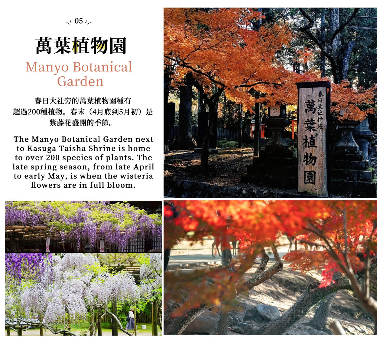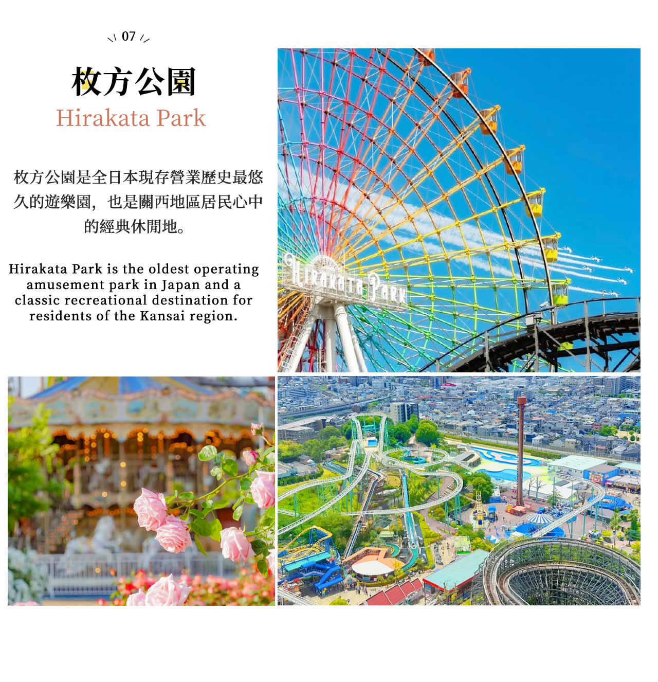 오사카 닛폰바시에서 출발하여 먼저 나라를 즐겨보세요: 먼저 다가오는 영험한 사슴과 교감하며 먹이를 주고, 도다이지에 들어가 세계 최대 목조 건축물을 구경하고, 와카쿠사산에 올라 나라 전체를 굽어보고, 가스가타이샤의 주홍빛 신전과 석등에 들러보세요. 그 후 이코마산 놀이공원에 가서 하늘 자전거를 타고 오사카, 교토, 나라 세 도시의 풍경을 감상하세요. 놀이공원이 문을 닫으면 히라카타 파크에 가서 나무 롤러코스터와 관람차를 타며 즐거움을 만끽할 수 있습니다. 유연하고 여유로운 일정으로 가족, 커플, 혼자서도 간사이의 정수를 몰입감 있게 경험하며 편안하고 즐겁게 즐길 수 있습니다.