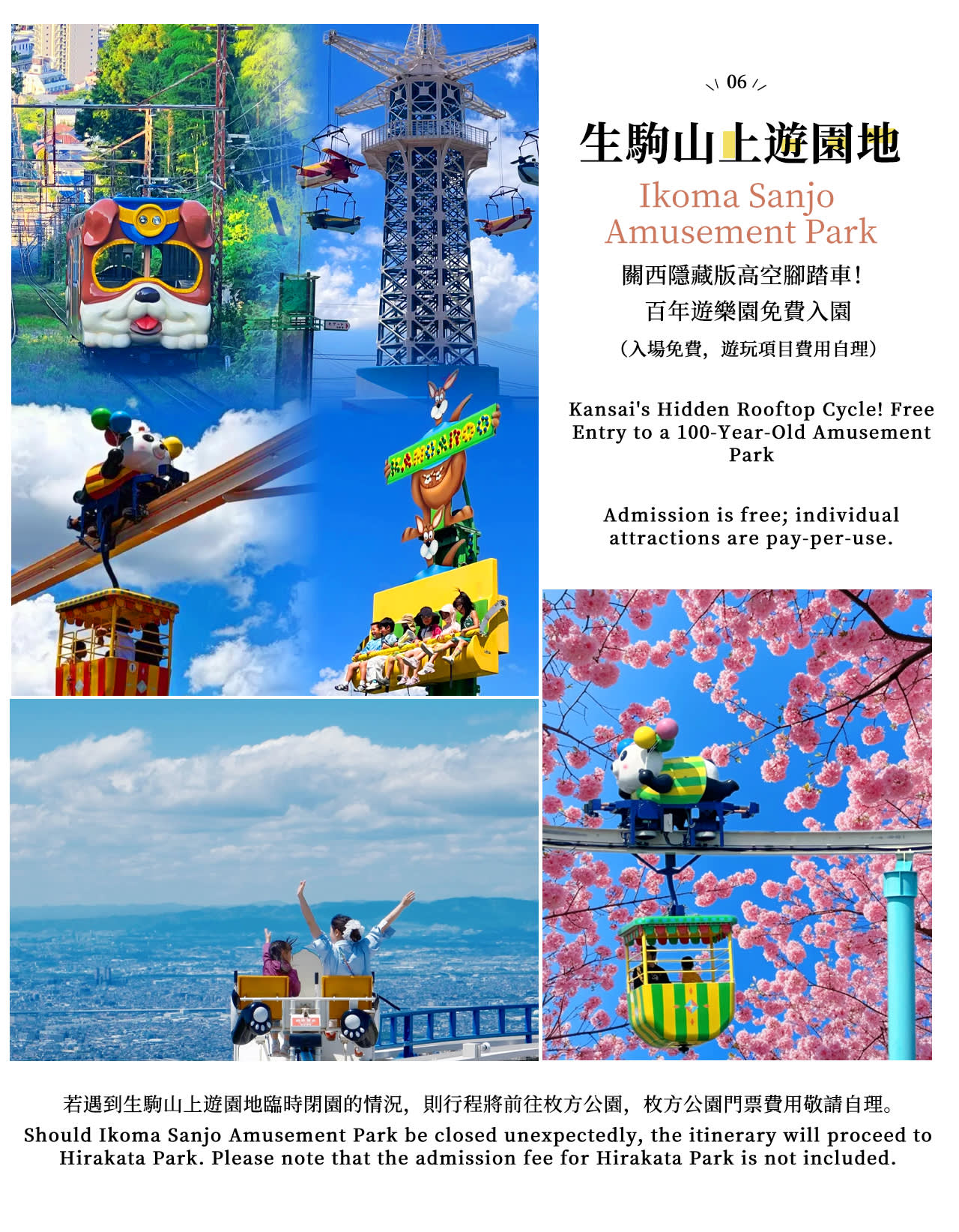 ▶【중국, 홍콩, 대만 전용 혜택】 지정된 집합 장소에서 출발 - 이용요건 * 본 상품은 이용 가능 연령이 제한되어 있지 않습니다. * 공지: 영유아 및 아동도 탑승객 인원수에 포함되어야 합니다. * 만 0-2세는 별도의 좌석이 필요하지 않은 경우 무료입니다. * 만 3세 이상은 성인과 동일한 요금이 적용됩니다. * 만 70세 이상 시니어는 참여 전 반드시 의사의 소견서를 받으셔야 합니다. - 추가정보 * 여행 전 안내: 출발 전날, 일본 시간 16:00~22:00 사이에 자세한 가이드 및 차량 정보를 이메일로 보내드릴 예정이오니 반드시 확인해 주시기 바랍니다. 성수기에는 이메일 발송 시간이 다소 지연될 수 있습니다. 특별한 사정으로 인해 이메일을 여러 통 받으신 경우, 마지막 이메일을 기준으로 확인해 주십시오. * 이코마 산 조이랜드가 임시 휴원하는 경우, 히라카타 파크로 여정이 변경됩니다. - 규정 및 제한사항 * 본 액티비티는 고혈압, 간질 등의 의학적 질환을 앓고 계신 분에게는 권장하지 않습니다. * 음주 상태의 참여자는 서비스 이용이 거부될 수 있습니다. 이 경우 환불은 불가합니다. * 외부 음식물 반입은 불가합니다. * 당일 기상 상황에 맞는 복장을 착용하세요. - 편의성/접근성 * 아동용 카시트를 이용할 수 없습니다. - 차량 & 수하물 정보 * 예약된 차량에 수용할 수 있는 규모보다 탑승객 인원수 또는 수하물 개수가 초과되는 경우, 운영업체는 예약을 거부할 권리가 있습니다. 이 경우 환불은 불가합니다.