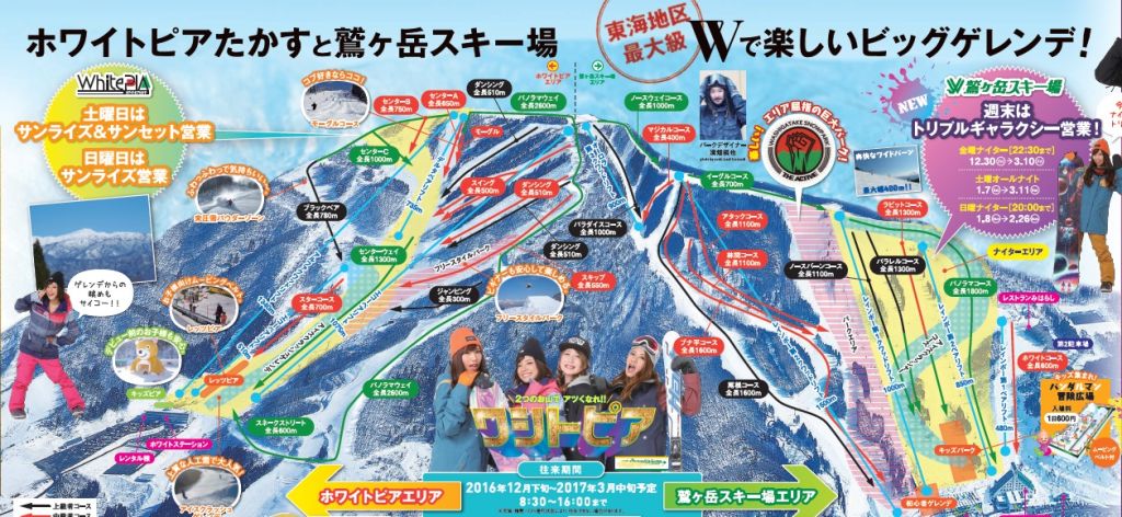 게렌데는 총 길이 2,300m, 13코스로 구성되어 있으며, 자연 지형을 살린 것이 특징인 ‘화이트피아 다카스(White PIA Takasu)’의 리프트 1일권과 왕복 버스가 포함된 당일 버스 상품입니다.