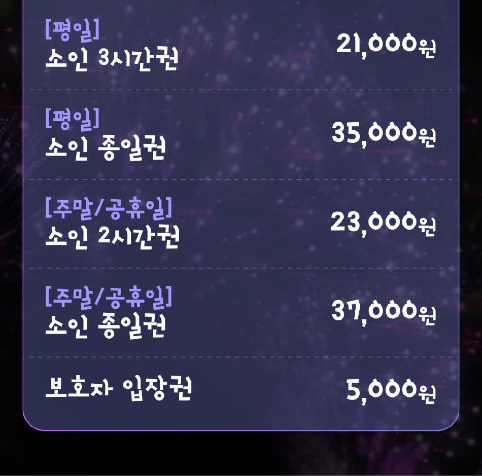 - 이용 방법 : QR/바코드 확인 후 입장- 유효기간 : 2025.10.10 ~ 2025.12.31- 당일이용 가능여부 : 당일 이용 가능