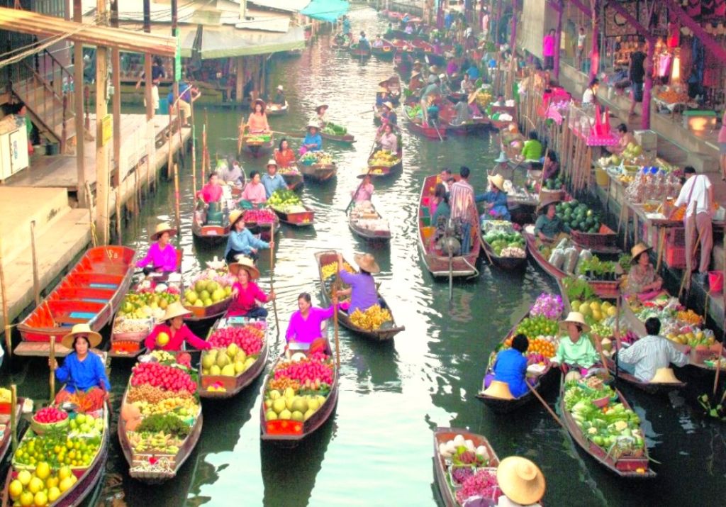 수로를 따라 줄지어 선 상점과 가판대에서는 신선한 열대 과일,