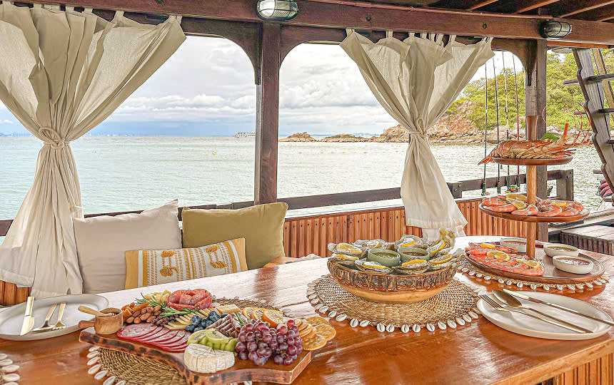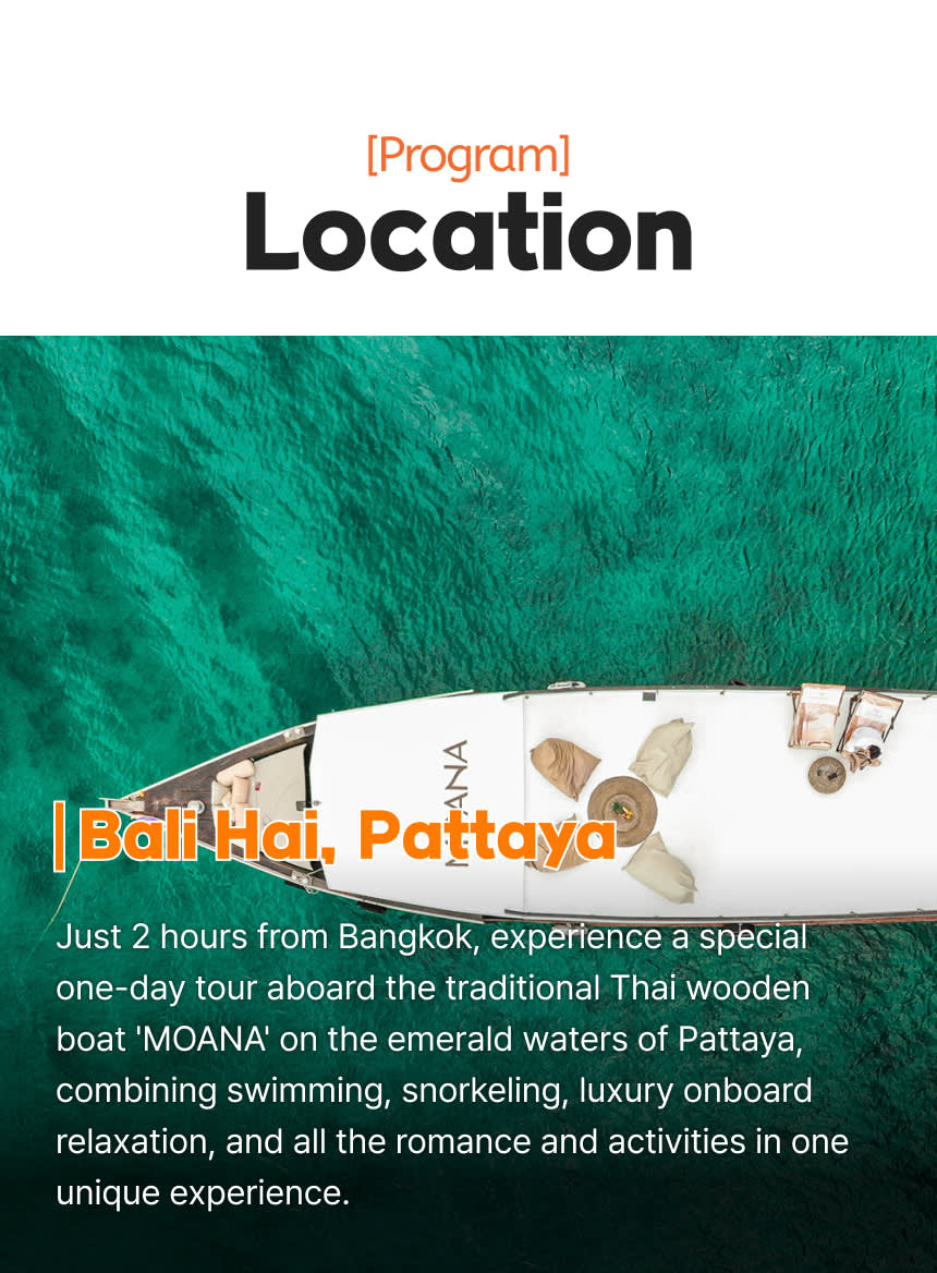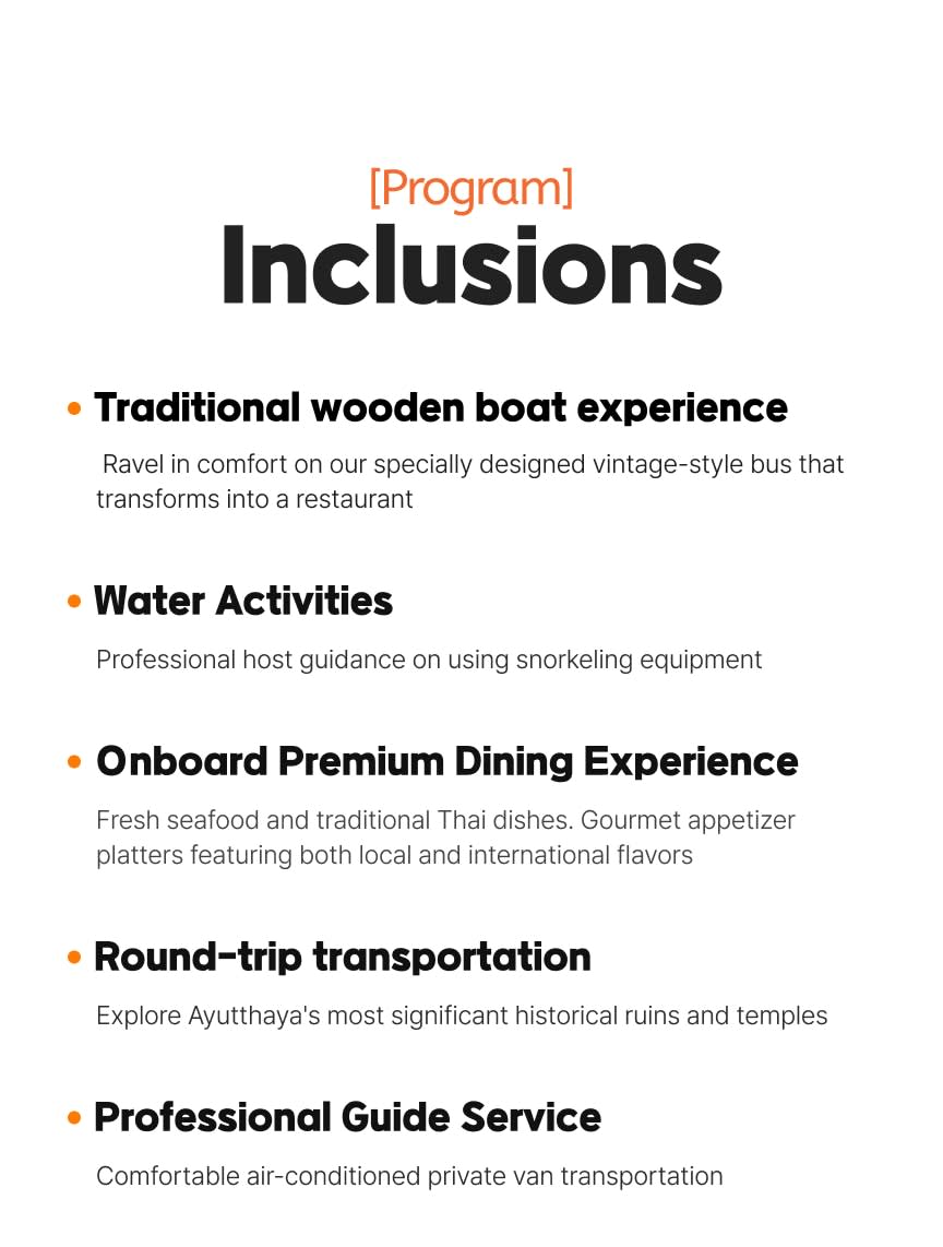타이 우든 비치 클럽 보트 트립을 타고 꼬란에서 특별한 경험과 멋진 풍경, 맛있는 식사, 신나는 액티비티를 즐기고 최고의 안전을 누려보세요. 본 투어에서는 웰컴 드링크, 해산물 플래터, 태국식 볶음밥, 닭고기/돼지고기 바비큐, 얼음, 물, 청량음료, 제철 과일 플래터 등 다양한 음식을 제공합니다. 낚시 장비, 사시미 서비스, 스노클링 장비, 카약, 구명 조끼, 수건 등의 액티비티도 포함되어 있습니다.