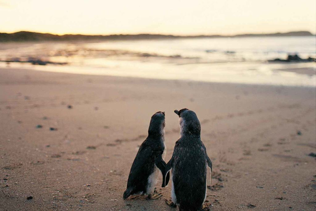 세계적으로 유명한 펭귄 퍼레이드에서 석양을 향해 돌아오는 리틀 펭귄을 구경하세요.