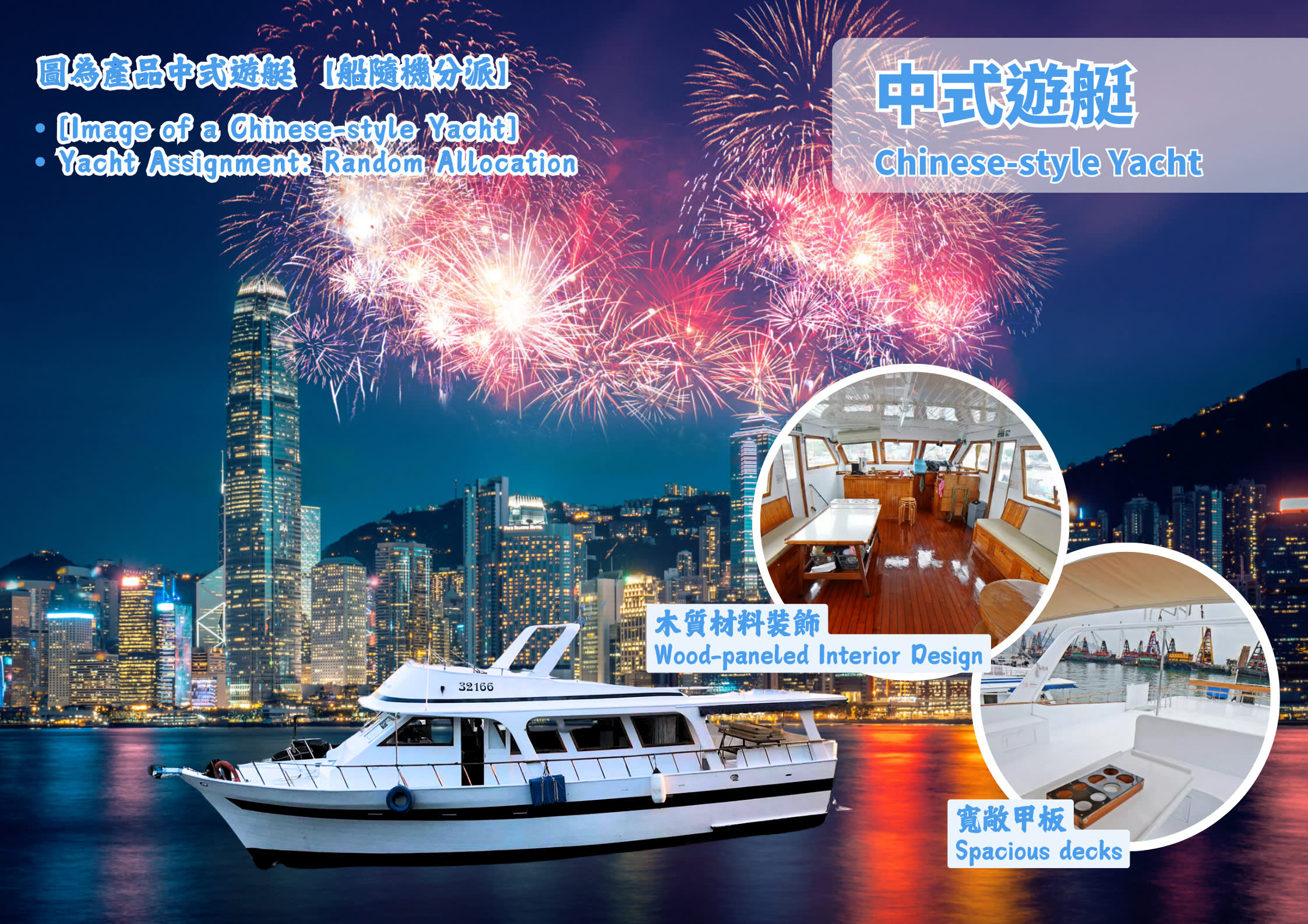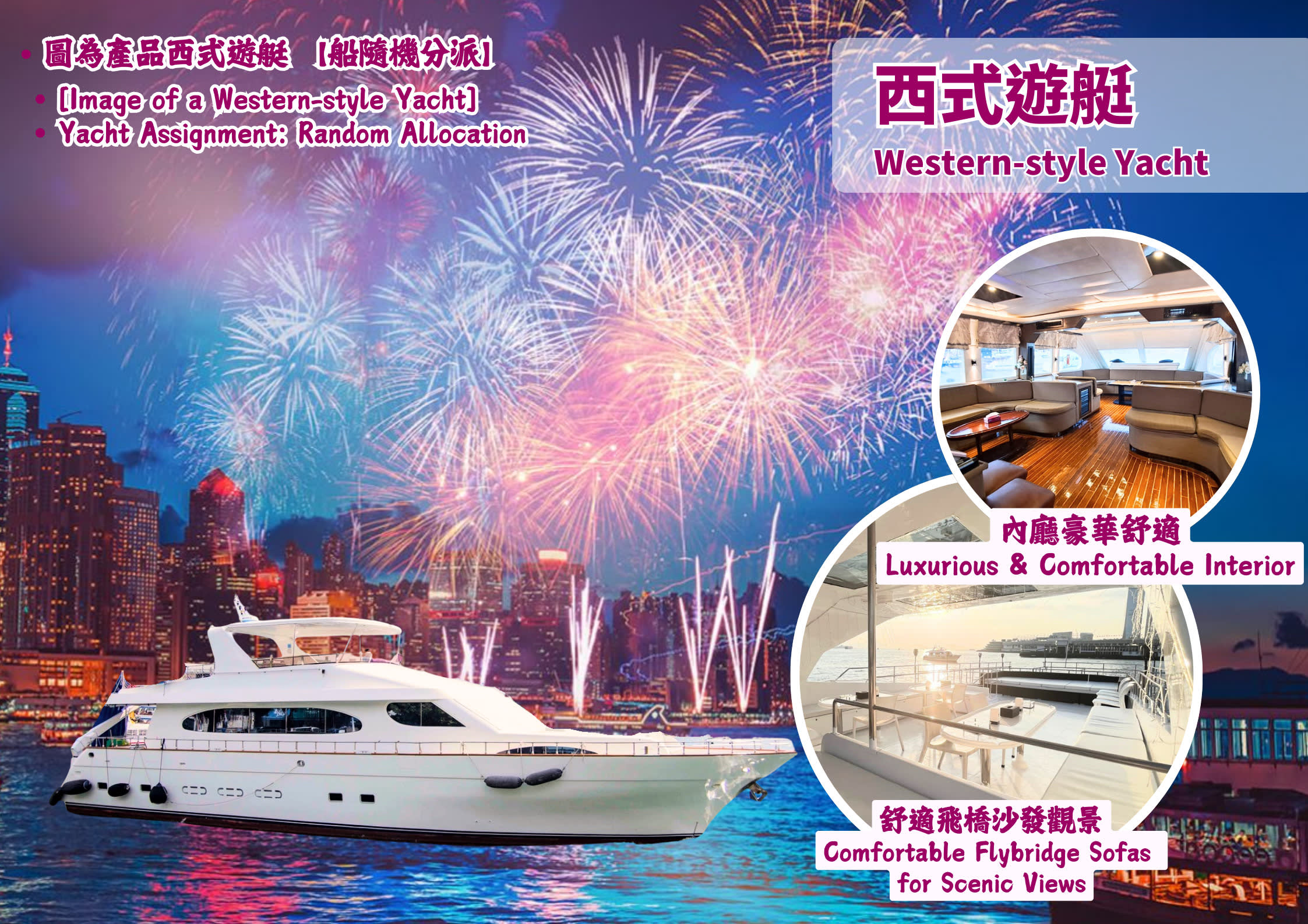 • 풍성하게 제공되는 엄선된 요리 • 맥주, 청량음료 및 엄선된 스낵 무제한 즐기기 • 전 일정 전문 버틀러의 세심한 서비스 • 럭셔리 요트 투어 • 막힘없이 탁 트인 최고의 전망을 독점적으로 누리기 • 럭셔리한 서양식 요트, 최상층 360도 전방위 시야의 루프탑 브릿지로 럭셔리한 승선 경험 선사 • 중국식 요트는 나무를 주요 재료로 사용하여 따뜻한 느낌을 연출하고 우아한 스타일을 강조