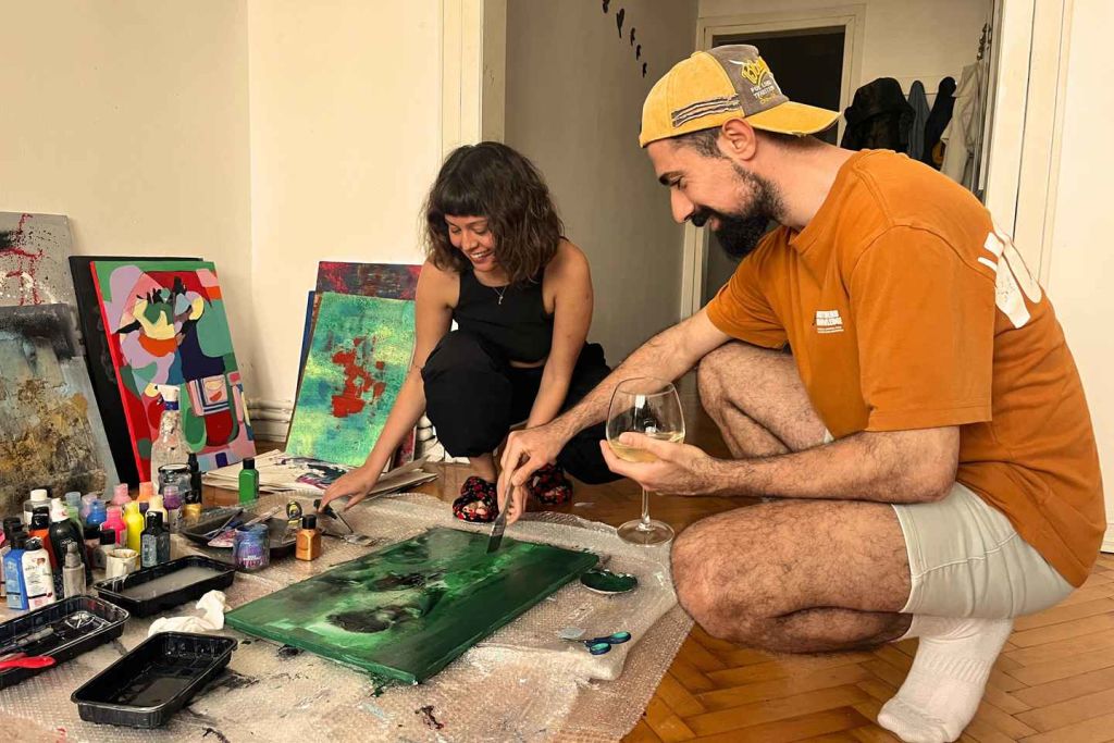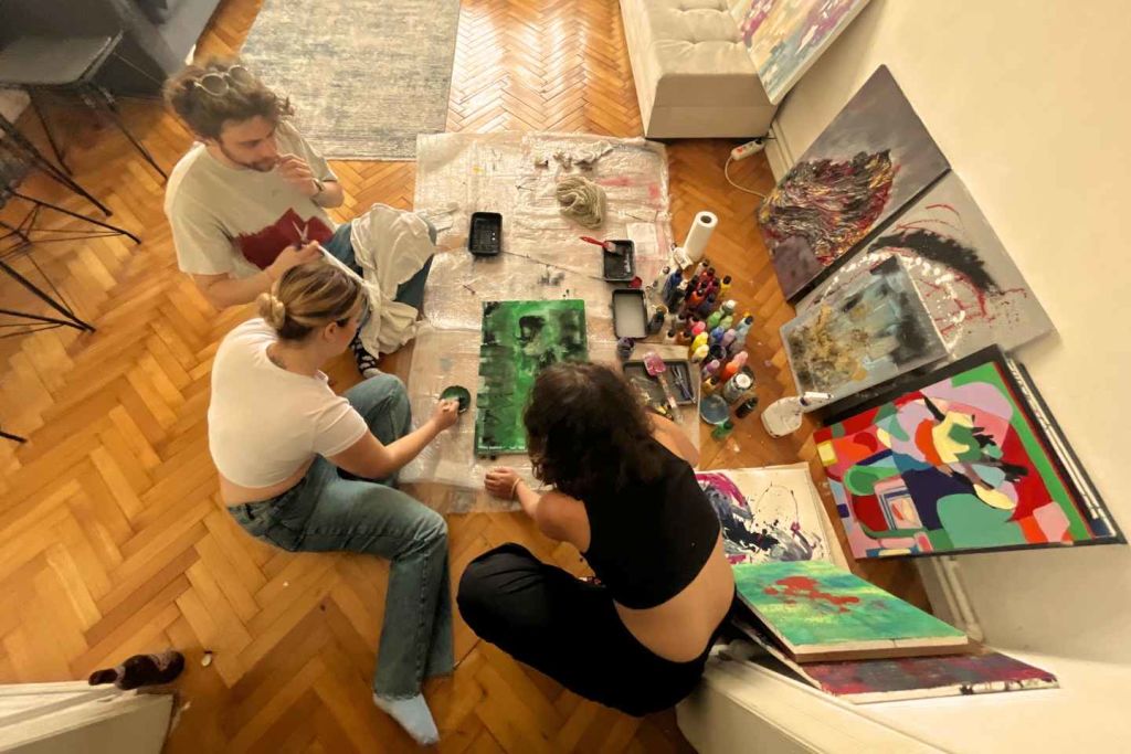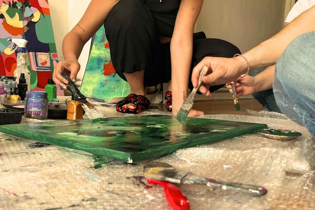 따뜻한 환영으로 시작합니다. 터키 커피 또는 차를 마시며 재료에 대해 간략하게 소개하고, 편안하게 적응할 시간을 갖습니다. 그런 다음 직물이 창의력을 이끌어내는 그림 그리기에 몰입합니다. 예술가이든, 붓을 잡는 것이 처음이든, 이곳은 판단이 없는 즐거운 공간입니다.
