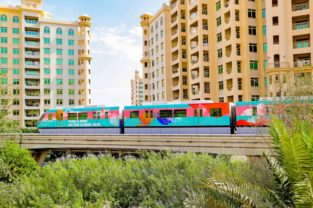 팜 주메이라를 가로지르는 팜 모노레일 안에서 아름다운 경치를 즐겨보세요.