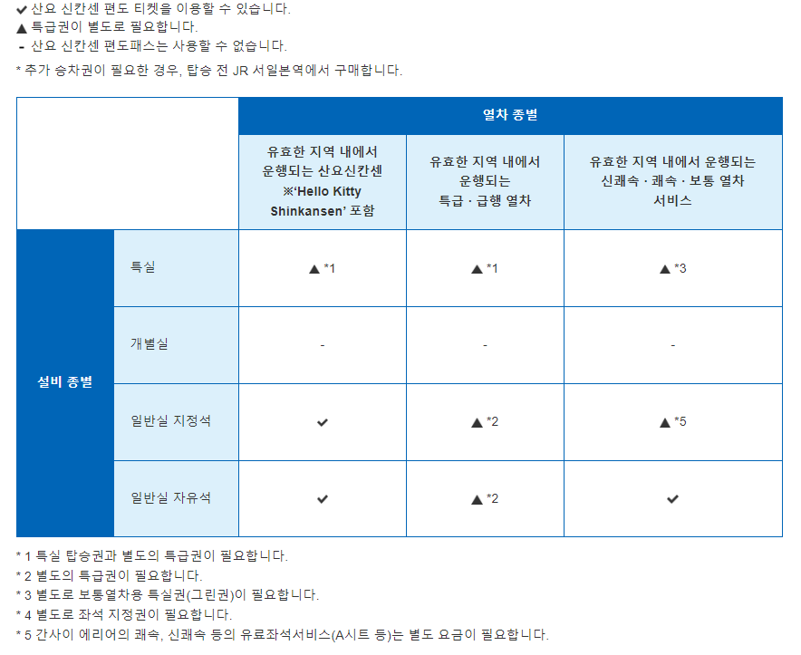 - 패스를 수령하려면 여권을 제시하여야 합니다.- 해당 상품은 본인에 한해서만 유효합니다.- 분실, 도난의 경우에도 재발행되지 않습니다.- 본 티켓은 '단기체제'에 해당하는 체류자격을 보유하고 있는 분만 사용 가능합니다.- 유학 비자, 취업 비자 소지자는 사용할 수 없으며, 일본 국적을 가진 분도 사용할 수 없습니다.- 하단의 안내 되는 추가 승차권이 필요한 경우, 탑승 전 JR 서일본역에서 미리 구매하여야 합니다.* 유효한 지역 내에서 운행되는 신요 신칸센 특실 이용 시 특실 탑승권과 별도의 특급권이 필요합니다.(Hello Kitty Shinkansen포함)* 유효한 지역 내에서 운행되는 특급, 급행 열차 이용 시 별도의 특급권이 필요합니다.* 유효한 지역 내에서 운행되는 신쾌속, 쾌속, 보통 열차의 특실과 지정석 이용 시 별도의 특실권(그린권) 혹은 좌석 지정권이 필요합니다.* 정리권 및 라이너권이 필요한 차량 및 열차를 이용하시는 경우에는 별도 요금이 필요합니다.* 유료좌석 서비스 신쾌속 ‘A시트’ 예약 및 이용시 별도요금이 필요합니다.* 지정석 예약에 대한 자세한 내용은 여기를 클릭해주세요. - 이 티켓은 자동개찰구를 이용하실 수 있습니다. 자동개찰구를 통과 하지 못한 경우 유인 개찰구를 이용해 주세요.- 설정구간을 한 장당 편도 한 번만 이용하실 수 있습니다.- 도중하차 시 잔여 구간은 무효가 되므로 주의하여 주십시오.- 자세한 티켓교환방법은 다음을 참고해 주세요.https://www.westjr.co.jp/global/kr/howto/guide/emco/- 창구에서 교환 하시는 경우, 희망하시는 열차번호를 알려주세요.* 희망하는 열차가 만석인 경우, 지정석을 이용하지 못할 수도 있습니다. 지정석으로 이용하지 못하셨더라도, 지정석과 자유석의 차액을 환불받으실 수 없습니다.- 자동발권기에 결함이 있거나 또는 여권에IC칩 부착이 없는 경우 지정된 역의 미도리노마도구치로 가서 실물티켓을 교환 하십시오.- 예약 확정 후 '내 여행' e-티켓(바우처)에서 만나는 시간과 장소를 반드시 재확인해주세요.- 상품페이지와 바우처 상의 정보가 다를 경우, 반드시 바우처 상의 정보를 확인 부탁드립니다.