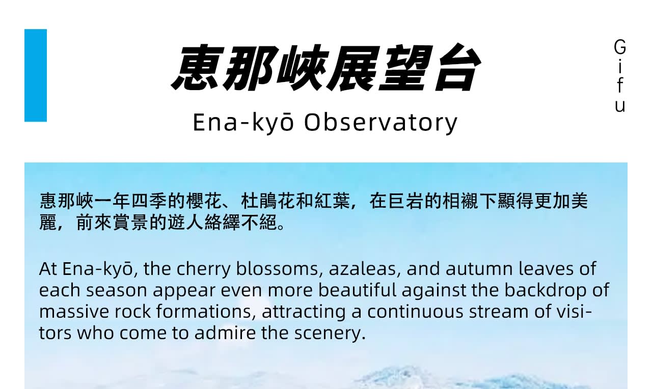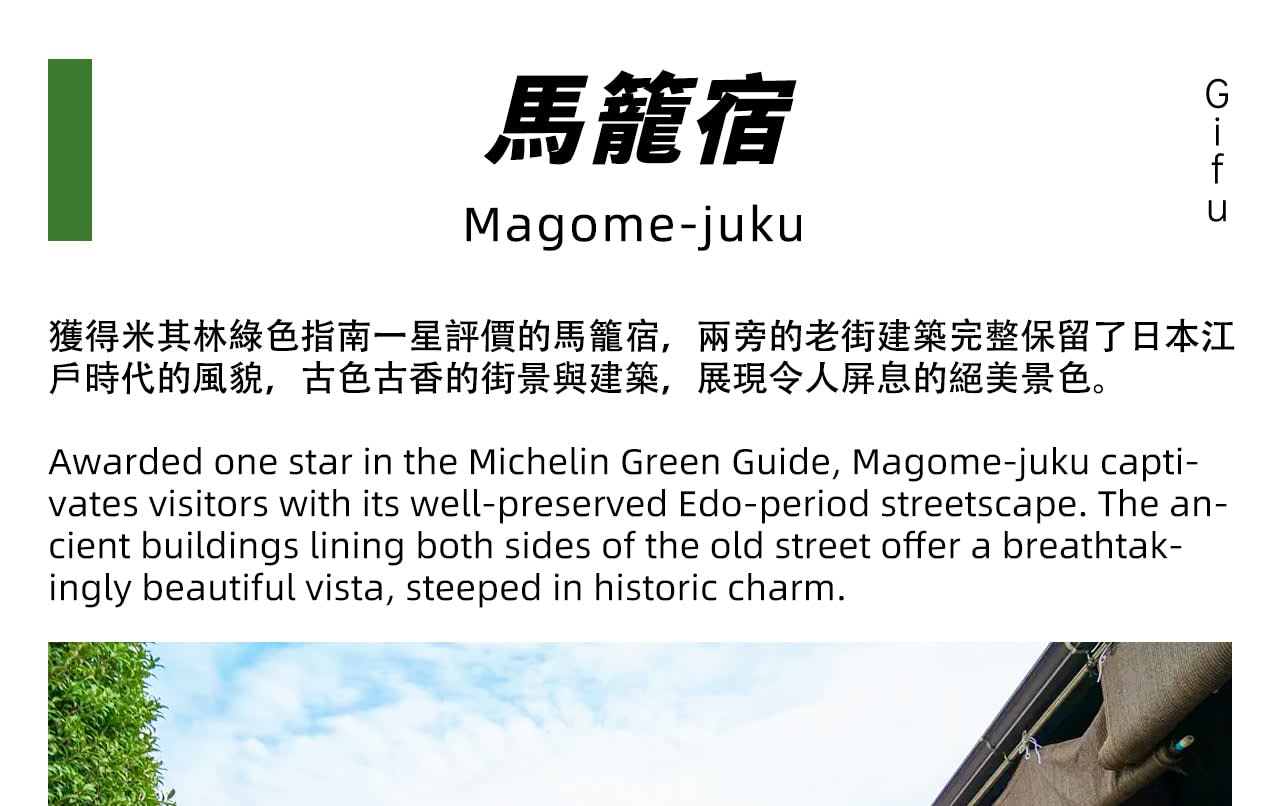 * 하루 만에 즐기는 주부(中部) 삼미(三味): 마고메주쿠에서 에도 시대 풍경을 찾고, 에나쿄 전망대에서 협곡의 풍광을 감상하며, 이누야마성에서 전국 시대 역사를 탐방합니다.