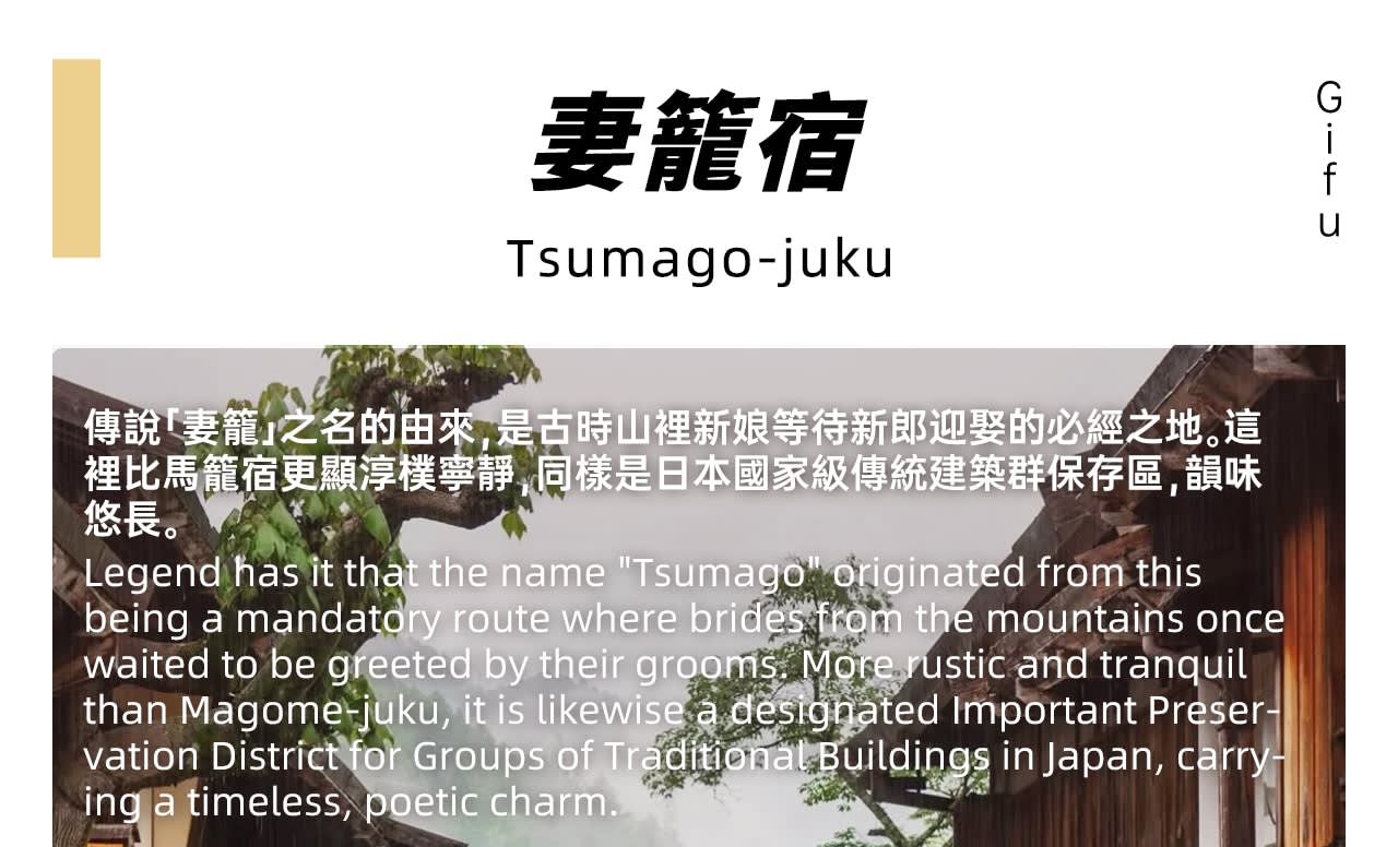 쓰마고주쿠 쓰마고주쿠는 옛날 산골의 신부가 신랑을 맞이하기 위해 반드시 거쳐야 했던 곳이라는 전설이 있으며, 일본 최초의 '중요 전통 건조물군'으로 마고메주쿠보다 더 소박하고 조용하며, 그 사이를 거닐면 옛 여행자들이 쉬어가던 여유로운 시간을 느낄 수 있습니다.