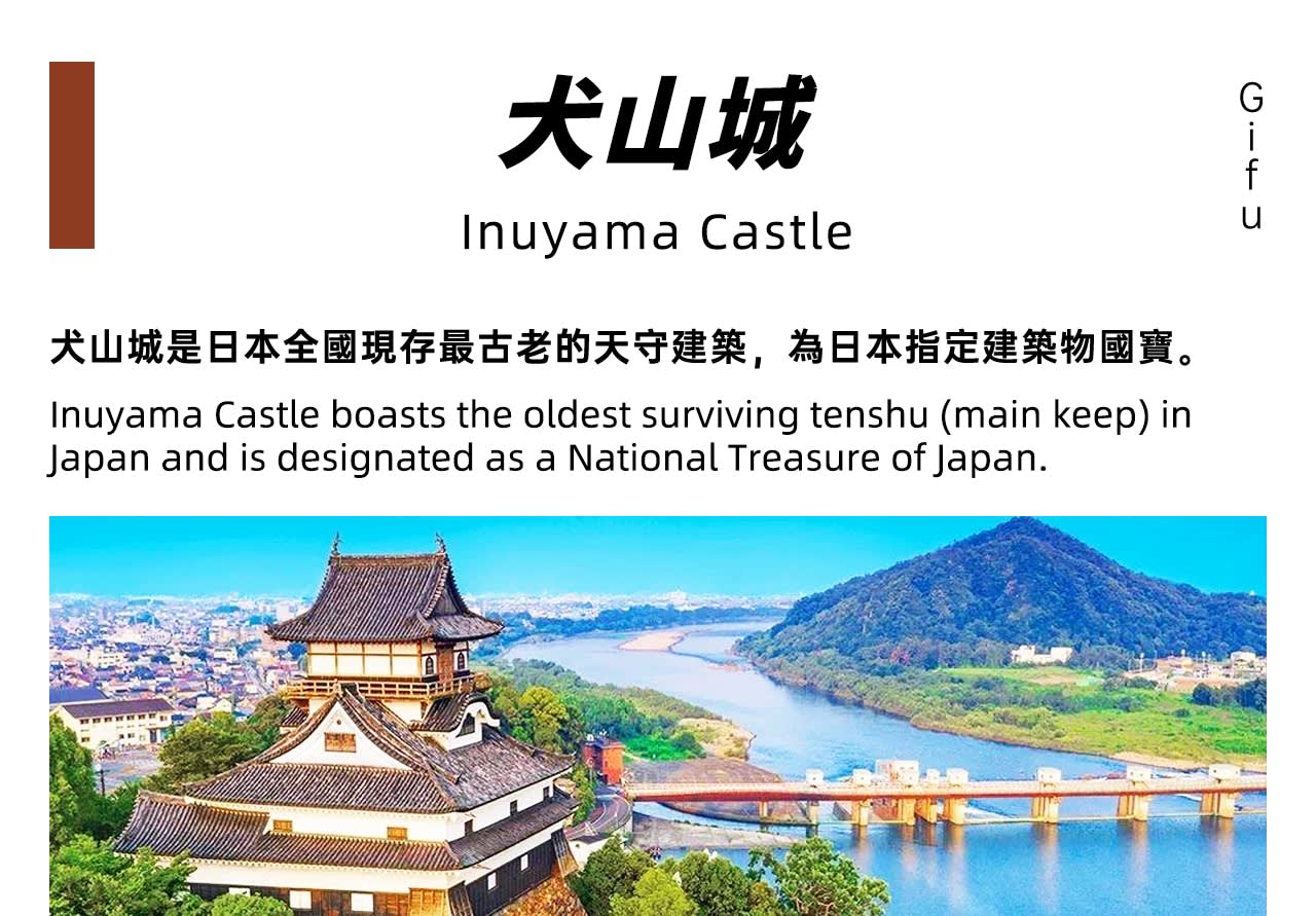 첫 번째 목적지는 이누야마성입니다. 이누야마성은 일본에서 현존하는 가장 오래된 천수각 건축물로, 일본 지정 건축물 국보이며 히메지성, 마쓰모토성, 히코네성과 함께 '일본 4대 국보성'으로 불립니다. 방문객들은 천수각에 올라 최상층 전망대에서 기소강과 성하마을의 풍경을 한눈에 담고 전국시대의 분위기를 느낄 수 있습니다.