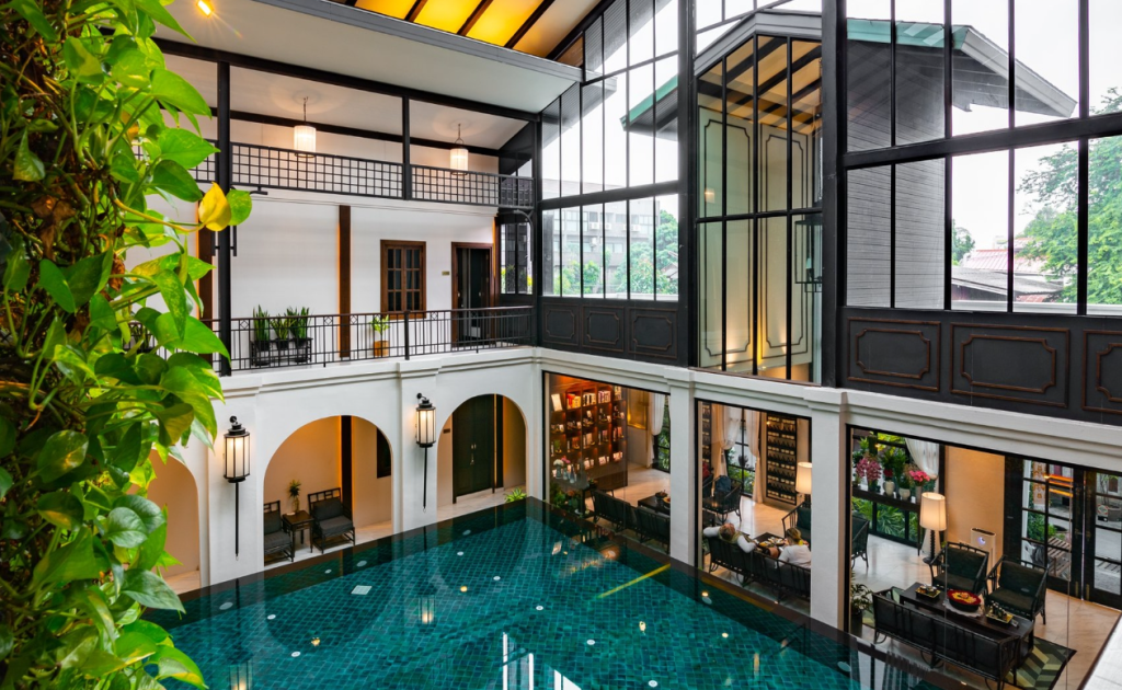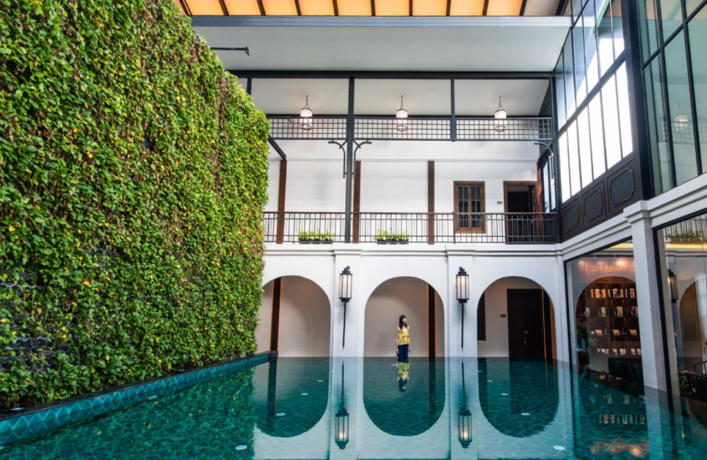 높은 천장과 아치형 인테리어, 청록색 수영장이 돋보이는 곳이에요~