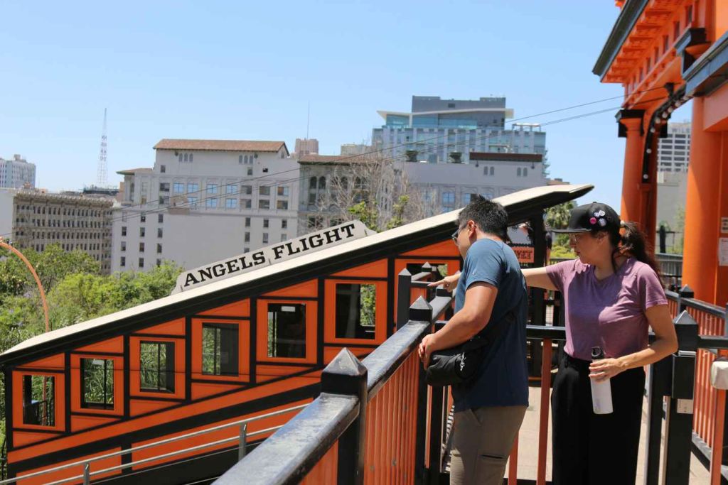 힐과 올리브 스트리트 사이를 이색적으로 운행하는 역사적인 케이블카 엔젤스 플라이트도 감상하세요. "세계에서 가장 짧은 철도"라고 불리는 이 매력적인 명소는 오렌지색과 검은색 두 대의 차량이 가파른 경사를 가로지르며 도시 경관의 멋진 전망을 선사합니다.