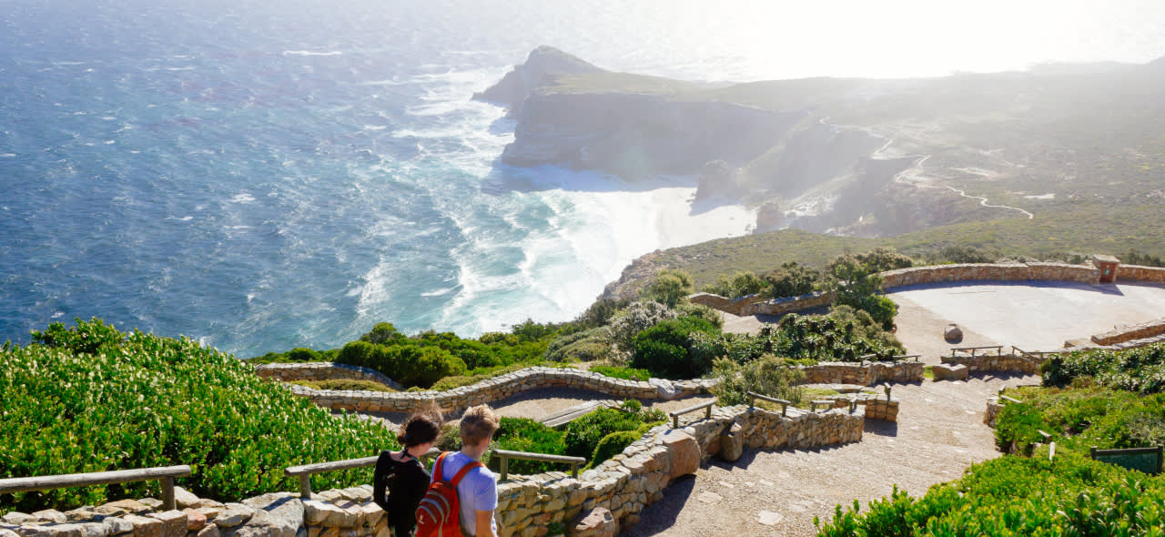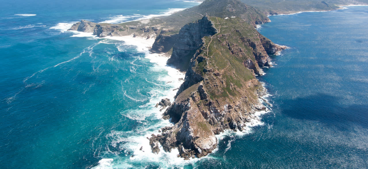 케이프 포인트 자연 보호 구역에 도착합니다. 하이킹을 하거나 플라잉 더치맨 푸니쿨라(선택 사항)를 타고 대서양과 인도양이 만나는 신화적인 지점의 탁 트인 전망을 감상할 수 있는 상징적인 케이프 포인트 등대로 가보세요.