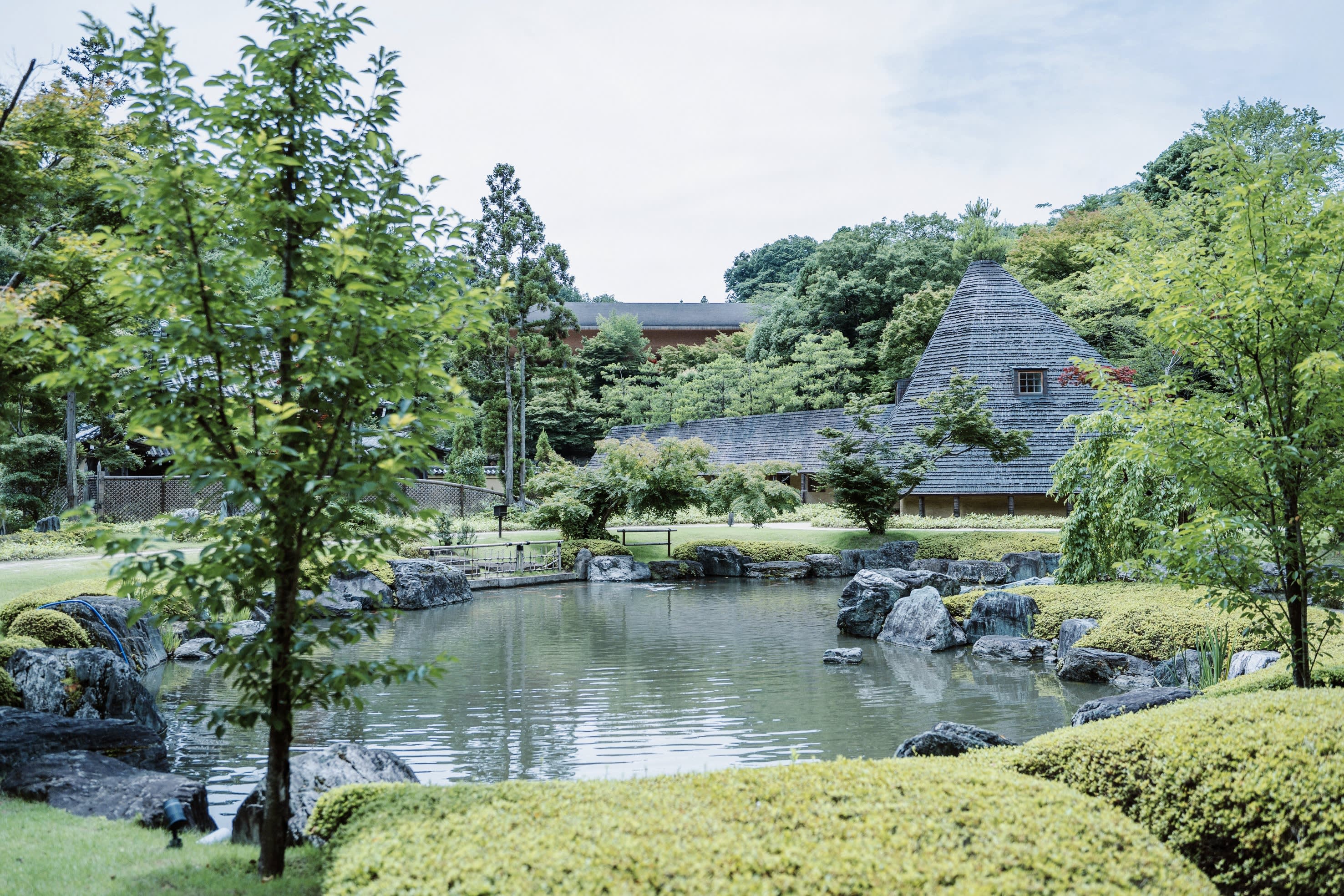 광대한 경내에는 시가현에서 이축한 17세기의 당우와 복원된 센노리큐의 다실, 건축가이자 건축사가인 후지모리 테루노부가 산요도에서 세토우치 일대를 상징하는 식물인 소나무를 많이 사용하여 설계한 사무소 등이 곳곳에 있으며, 그 건물 사이를 잇듯이 정원이 배치되어 있습니다.
