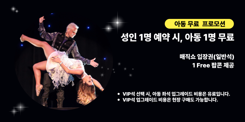 2026년 1월까지 : 매주 화/금요일 오픈 2026년 2월부터 : 매주 월/금요일 오픈 극장 사정에 따라 비정기 휴무가 발생할 수 있습니다. 개인적인 사유(예: 병가, 단순변심 등)로 인한 예약 취소의 경우, 취소 수수료가 적용되는 기간 내에는 예약 양도가 불가합니다. G-CNMI-ETA(또는 ESTA) 발급 거부는 개인 사유에 해당하므로 환불 사유로 인정되지 않으며, 예약 시 적용된 취소 규정이 그대로 적용됩니다. 본 상품은 개별이동 상품입니다. 픽업/드랍 차량 서비스가 제공되지 않습니다. 크라운 플라자 호텔에 무료 주차 가능합니다. 만차 시, 세큐리티 가드가 홀리데이 호텔 인근 임시 주차장으로 안내하고 있습니다. 좌석은 랜덤 배정입니다. (VIP석 구매 시, 앞 2~3열 착석 개런티) 36개월 미만 유아는 좌석이 제공되지 않습니다. (보호자의 무릎 위 착석) 디너 패키지 상품 구매시, 디너 테마(메뉴)는 호텔 사정에 따라 예고 없이 변동 될 수 있습니다. 식사 포함 상품은 뷔페로 제공하나, 호텔 사정에 따라 예고 없이 단품 (A La Carte) 메뉴로 변경 될 수 있습니다. 공연이 끝난 후 마술사와 무료로 사진 촬영을 하실 수 있습니다.