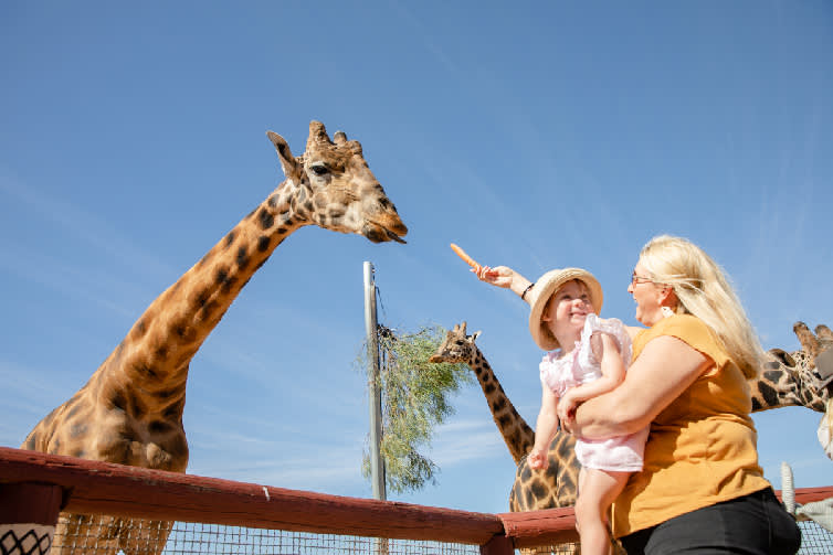 거대한 기린에게 직접 먹이를 주세요