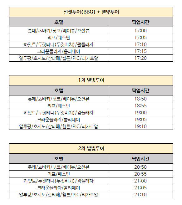 [주의사항] - 예약 시 전 인원에 대한 인원수를 설정해주시기 바랍니다. - 24개월 미만 유아 무료이나 예약 후 동반여부를 필히 말씀해주세요. - 기상 악화로인하여 천체 관람이 어려울 경우 취소될 수 있으며 이 경우 전액환불 가능하나 촬영 도중에 취소되는 경우 환불이 불가합니다. - 기상에 따라 별빛이 희미하게 보일 수 있으며 그에 따른 환불은 불가합니다. - 투어 현장에 화장실이 없으니 차량 탑승 전 미리 다녀 오시는걸 추천 드립니다. - 천재지변으로 행사 취소시에는 전액 환불처리 됩니다. - 고객 부주의 등으로 발생한 부상, 사고는 당사에서는 책임이 없으므로 각종 사고에 대비 안전을 기해주십시오. - 해외여행 중 만일의 사고에 대비해 여행자보험 가입을 권해드립니다. - 여권, 지갑 등 중요 소지품은 숙소 금고에 보관 후 투어 진행을 권해드립니다. 귀중품 분실시 및 해당업체는 책임을 지지 않습니다. - 예약 시 남겨주신 인원(유아포함)보다 투어 당일 추가되는 경우 추가되는 인원은 투어가 불가합니다. - 투어 진행 하루 전날 괌 현지 업체에서 카카오톡으로 정확한 픽업 시간, 투어 안내 등을 받아보실 수 있습니다. - 예약을 신청하실 때 정확한 핸드폰 번호를 입력 부탁드립니다. - 투어 시작 하루 전 보내드리는 카카오톡 안내문을 필히 확인 부탁드립니다. - 개별 여행자 보험 가입을 권장드립니다. [픽업/드랍] - 본 상품은 픽업 및 드롭이 포함된 상품입니다. 예약 시 꼭 픽업 받으실 호텔을 적어주세요. - 예약완료 후 바우쳐 발송시 정확한 호텔 픽업시간을 기재해서 드립니다. - 픽업시 호텔로비 입구에서 현지업체 직원이 예약자 성함 확인 후 픽업 진행합니다. - 투어 전 현지업체에서 별도의 연락을 드리지 않으니, 픽업 시간 10분 전 호텔 로비에서 대기해주세요. - 단체투어 특성상 픽업시간에 늦거나 다른 장소에 있어 픽업을 놓쳤을 경우, 별도의 연락 없이 기다리지 않고 바로 출발하며 당사나 현지업체에 책임이 없음을 알려드립니다. - 게스트하우스 등 픽업 장소가 나와있지 않은 숙소는 인근 호텔에서 픽업 가능합니다. - 투어 규정 상 개별이동은 불가합니다. 개별이동으로 인해 투어 진행을 못한 경우 당사나 현지업체에서는 배상의 책임을 지지 않습니다. - 픽업 시간에 늦으시거나 사전 통보 없이 개별 이동하실 경우 투어 이용이 어려울 수 있습니다. - 투어 당일 현지 상황(ex. 교통체증 / 기상악화)에 따라 픽업 시간이 조정될 수 있습니다.