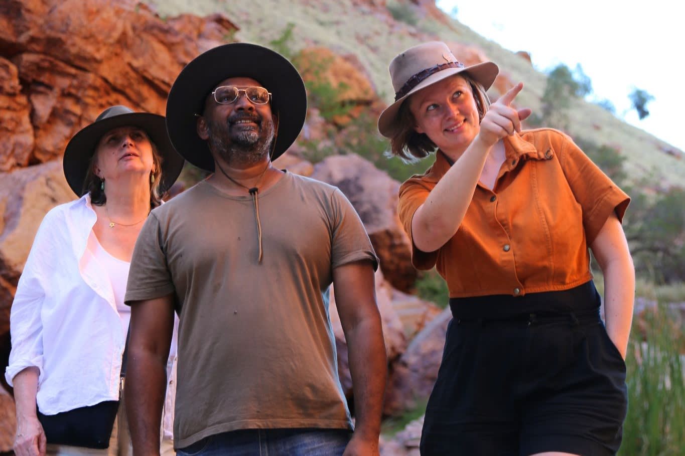해가 지면서 웨스트 맥도넬 산맥의 바위 능선이 짙은 붉은색으로 변하는 모습을 감상하고, 강가의 유칼립투스 나무 꼭대기에서 지저귀는 새들의 합창을 들어보세요. 아렌테족에게 중요한 영적 장소인 이곳에서 평화를 느껴보세요.