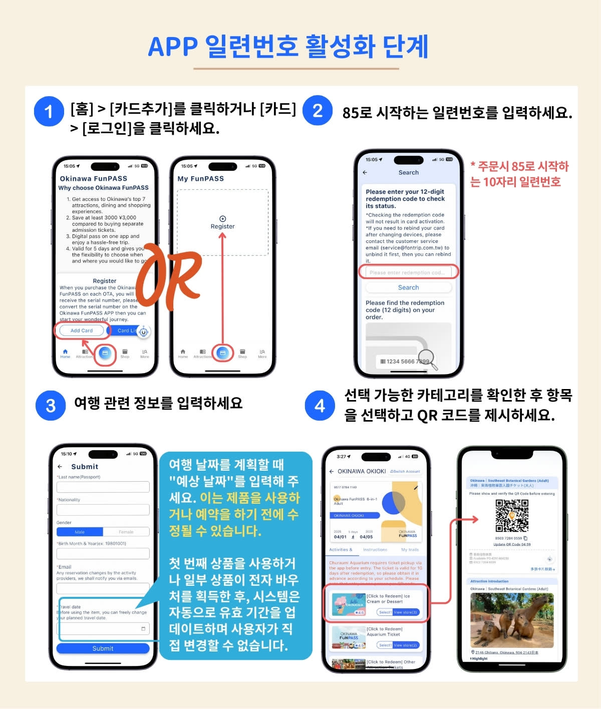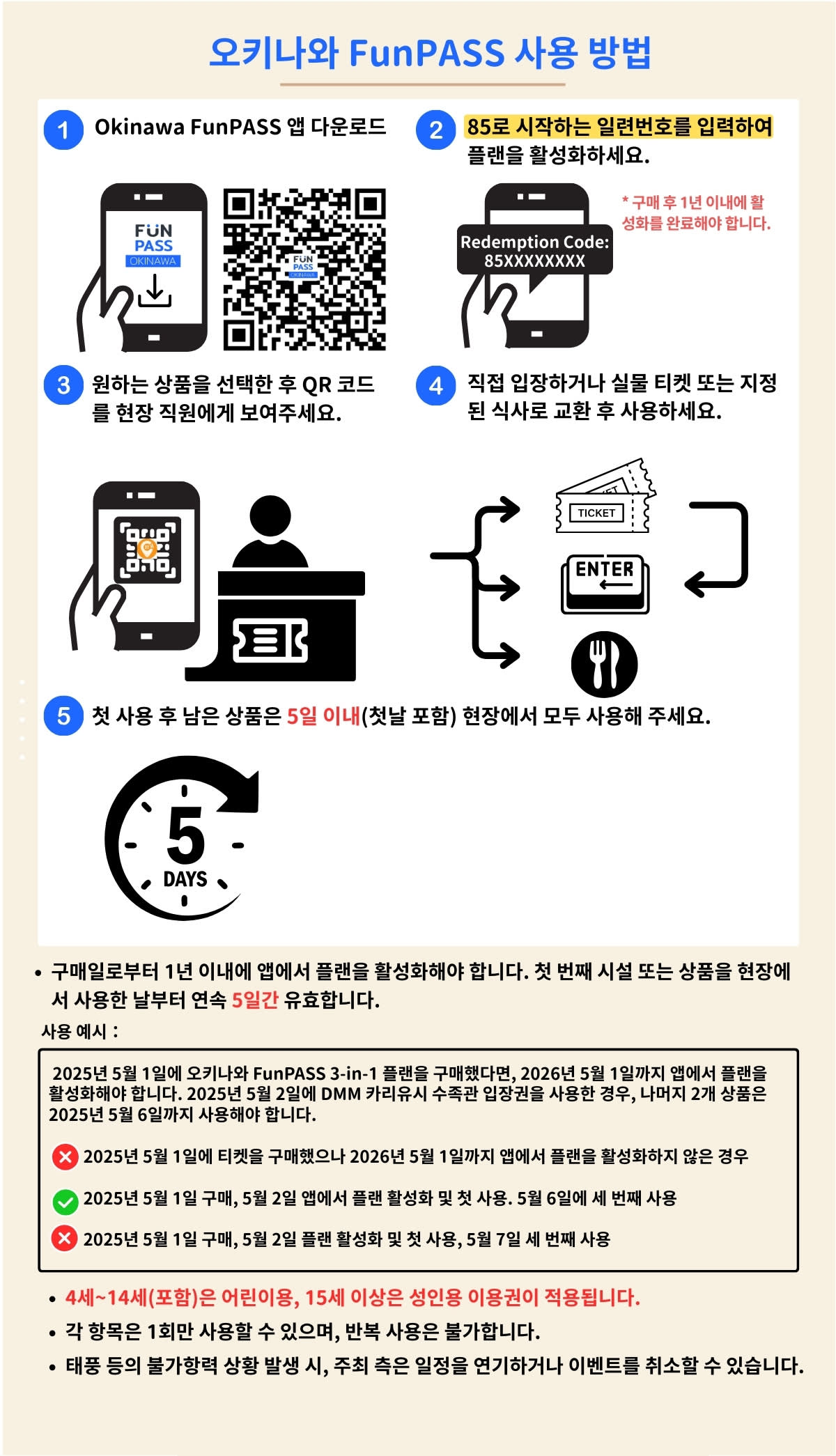 ⏰ 유효기간 안내 ① 펀패스 활성화 기간 ▪️구매일로부터 1년 이내 앱에서 활성화 필수 ▪️주문 영수증에 기재된 ‘85’로 시작하는 번호를 앱에 입력하면 활성화 완료 ▪️활성화 완료 시, 앱 상단 카드 및 하단 분류 목록에 상품이 표시됩니다. ▪️예시:2025/5/1 구매 → 2026/5/1까지 앱에서 활성화 필요 ② 사용 유효기간 ▪️최초 사용일(첫 입장일) 포함 5일 이내에 모든 상품 사용 완료해야 합니다. ▪️예시:2025/5/2 DMM 카리유시 수족관에서 첫 사용 → 나머지 상품은 2025/5/6까지 사용 완료