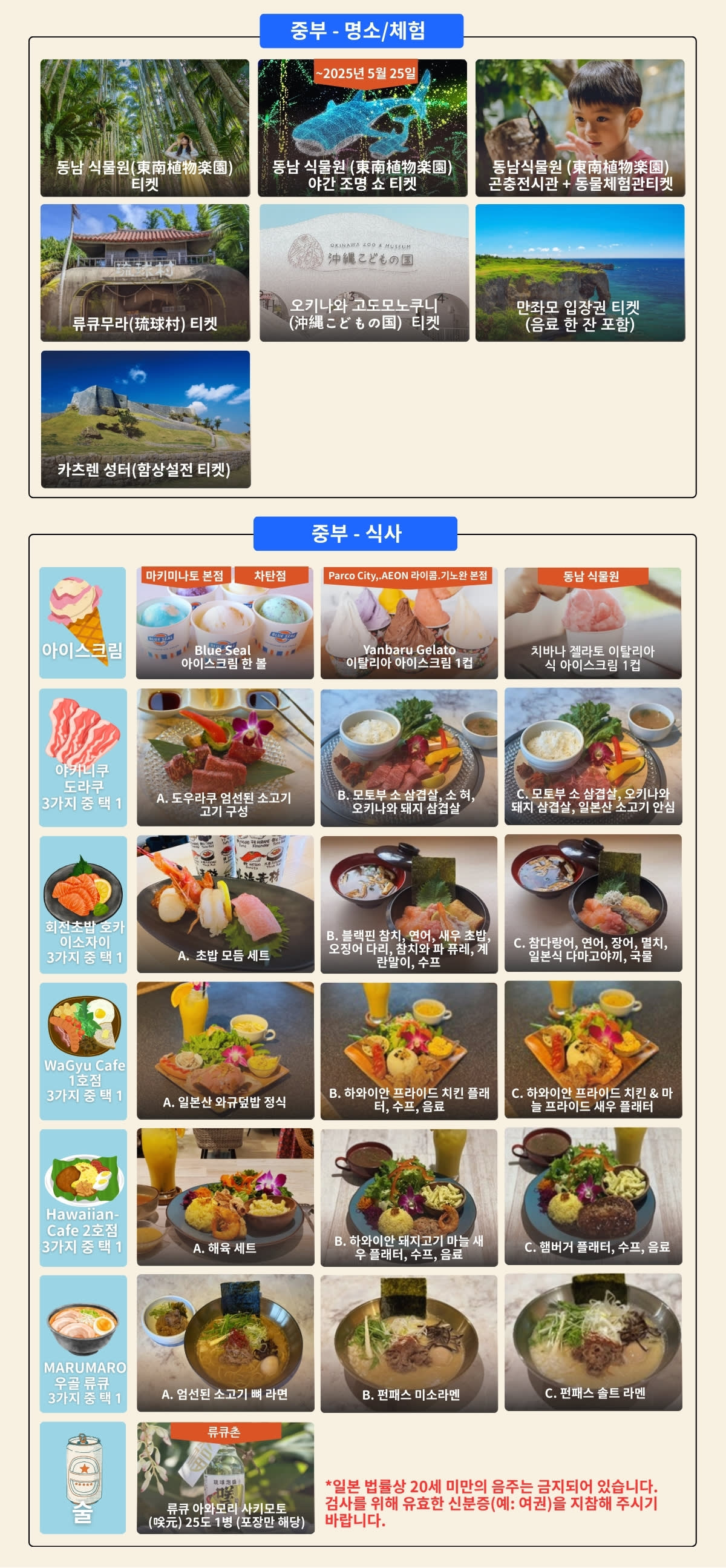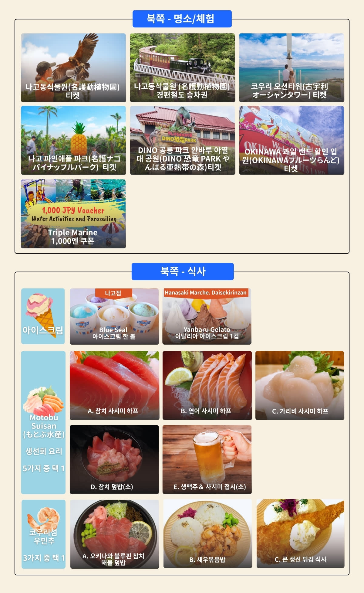 🔺현지 음식 즐기기: Blue Seal 아이스크림 등 다양한 미식 쿠폰 포함, 오키나와의 맛을 마음껏 만끽하세요.