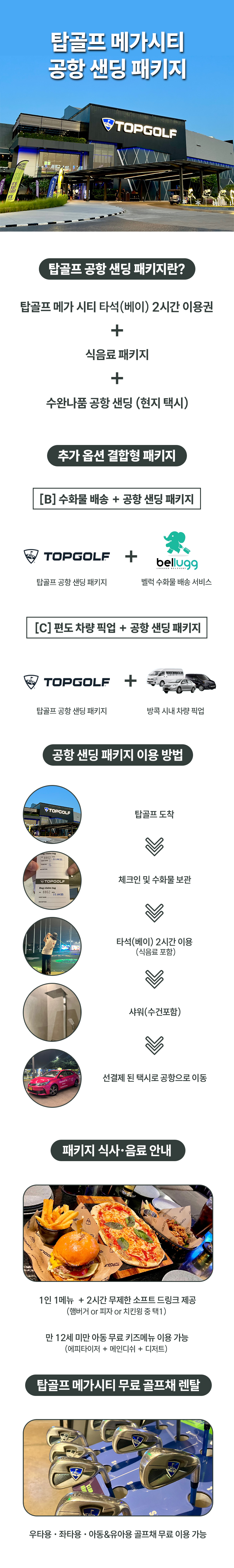 식사와 음료도 제공되는 상품입니다. 짐 보관은 물론 플레이 후 샤워시설도 이용하실 수 있고 공항 편도 택시까지 제공됩니다