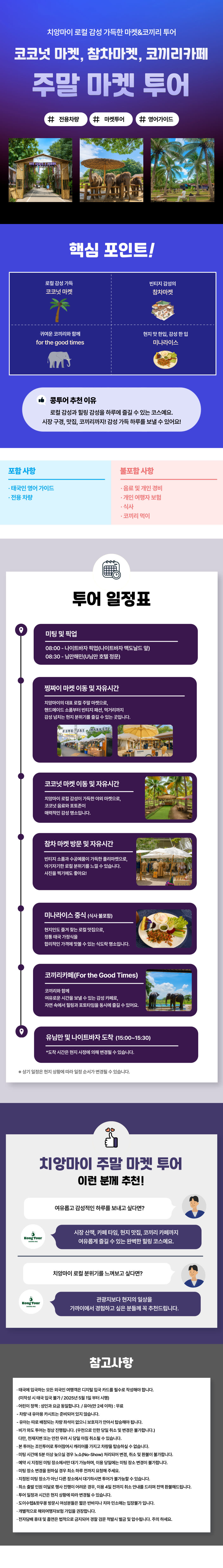 신선한 재래시장의 활기와 현지 감성이 가득한 짱짜이·코코넛·참차 마켓에서 치앙마이의 진짜 일상을 만나보고, 깔끔하고 편안한 분위기의 현지 식당 ‘미나라이스’에서 여유로운 점심 식사 후, 코끼리를 가까이에서 바라볼 수 있는 감성 공간 ‘코끼리 카페’에서 특별한 힐링 시간을 즐겨보세요!