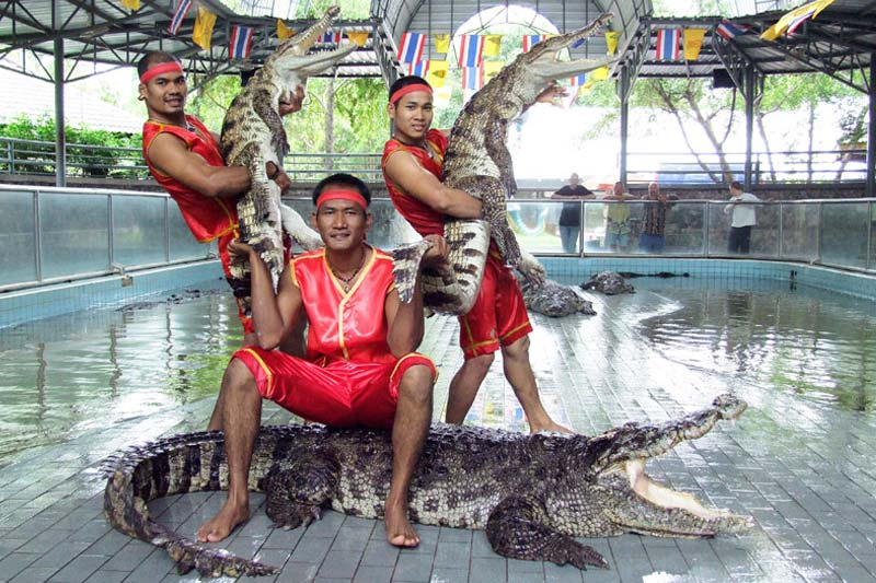 수천 마리의 악어가 있는 농장에서 박진감 넘치는 악어쇼를 관람합니다.