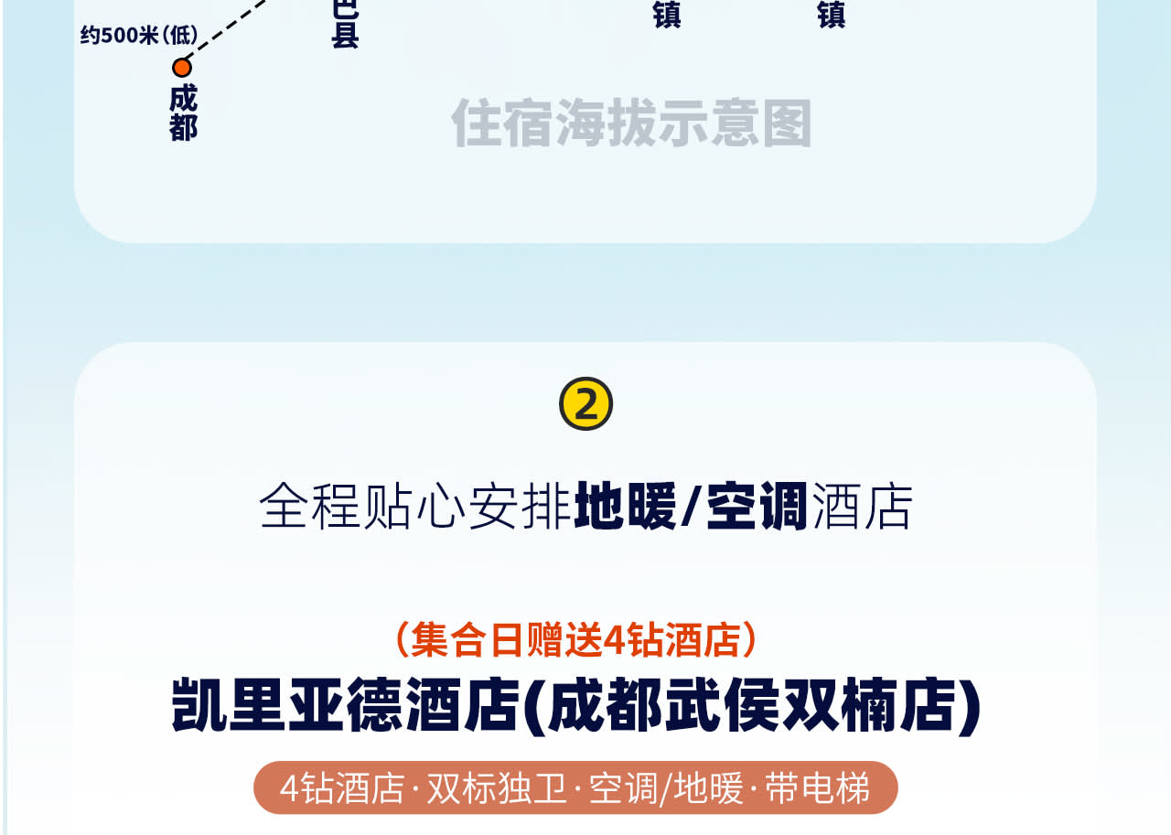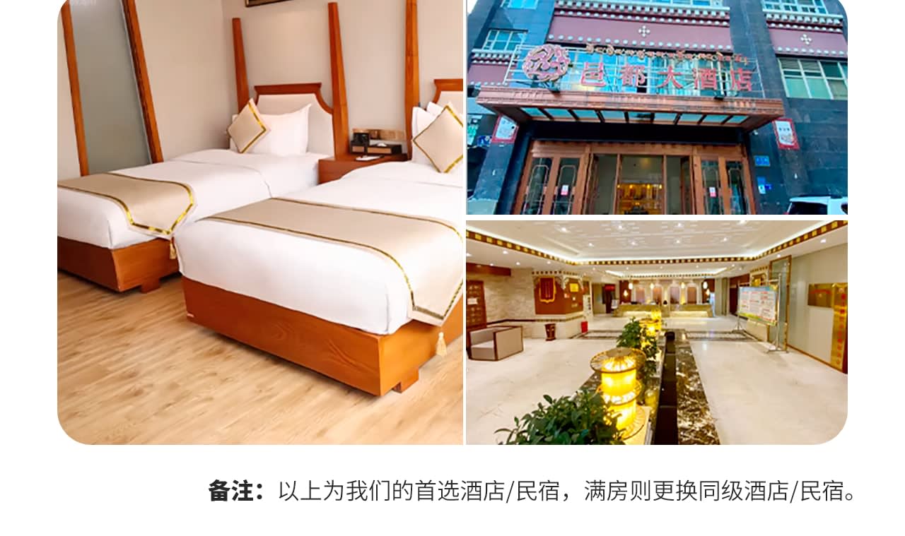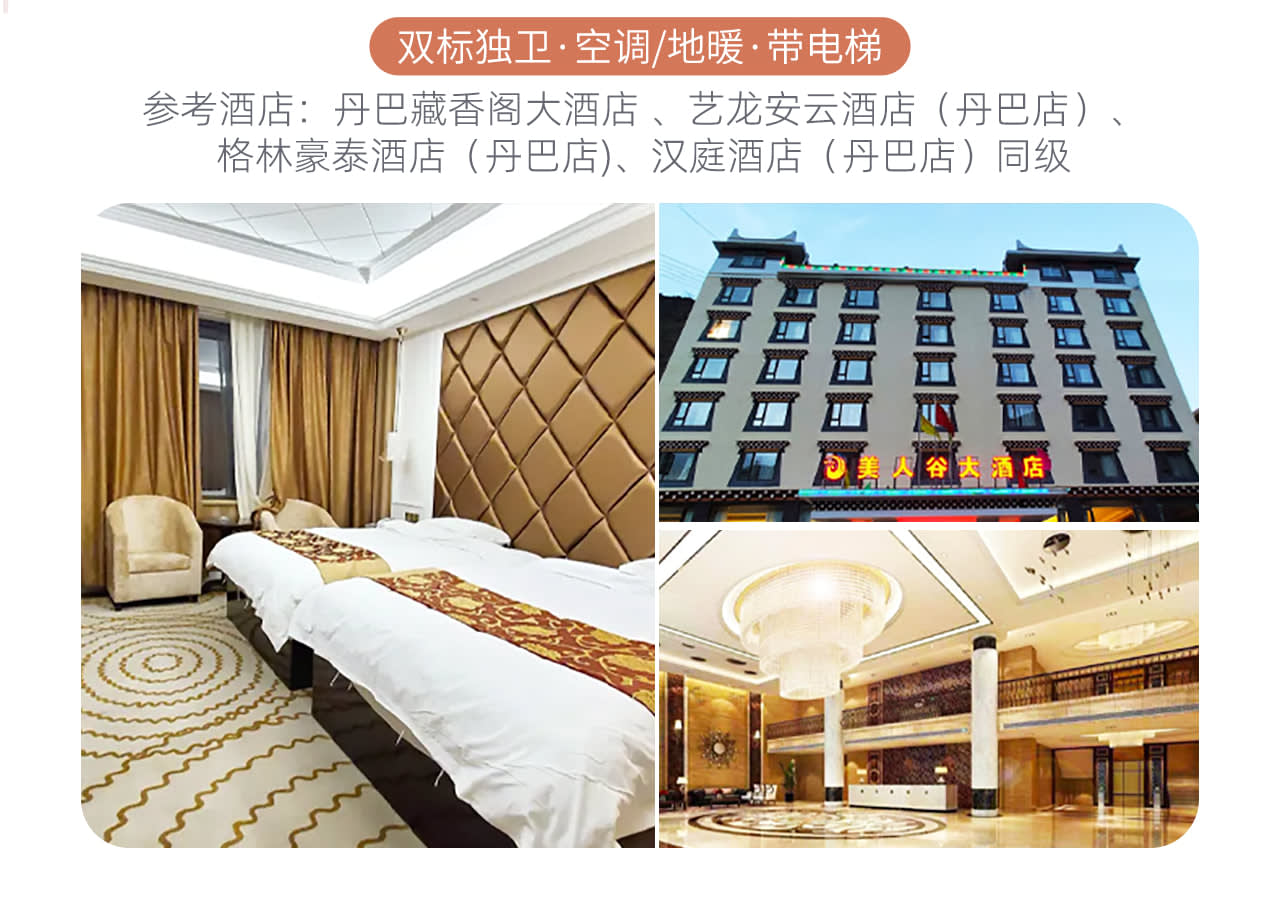 * [숙박 업그레이드] 전체 여정 호텔에 바닥 난방/에어컨 완비, 청두 4성급 호텔 업그레이드, 야딩은 저지대 지역에 숙박, 편안한 잠자리가 좋은 여행의 시작입니다.