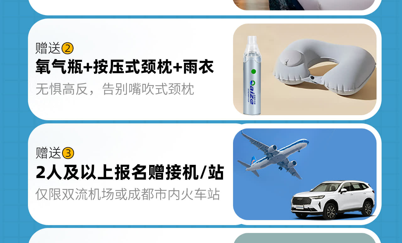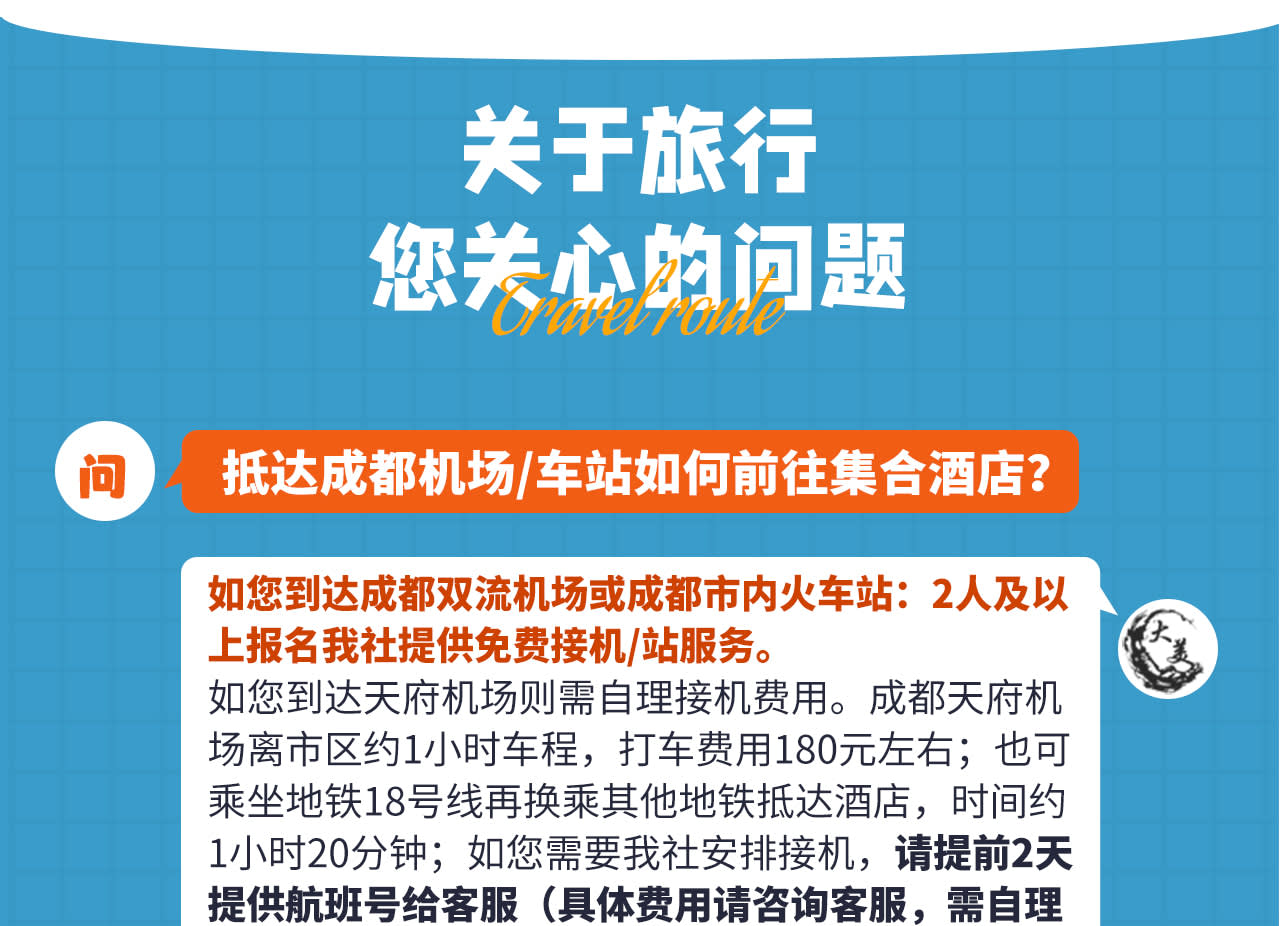- 활동 설명: * 【모집 안내】 2인 출발, 10인 팀 마감, 전 일정 운전기사 겸 가이드 동행. * 【적합 대상】 만 12세-65세 건강한 신체, 고혈압 및 심뇌혈관 질환이 없는 사람 (만 18세 미만은 보호자 동반, 만 55세 이상은 건강 검진 후 건강 상태 확인 필요). * 【출발 안내】 출발 1-3일 전, 청두 집합일 호텔 이름, 시간, 주소, 전화번호 등 관련 정보와 여행 준비물 안내 문자를 발송해 드리니 휴대폰을 꼭 켜두시기 바랍니다. - 특별 알림: * 1. 1일차 집합일은 자유 활동이며, 정식 일정이 아니므로 집합일에는 보험이 포함되어 있지 않습니다. 자유 활동 시 개인 소지품 및 안전에 유의하시기 바랍니다. * 1일차 집합일은 자유 활동이며, 정식 일정이 아니므로 집합일에는 보험이 포함되어 있지 않습니다. 자유 활동 시 개인 소지품 및 안전에 유의하시기 바랍니다. * 1. 티베트 지역은 수력 발전 공급이 부족하여 정전 및 단수가 잦을 수 있으니 물티슈와 손전등을 준비하시고, 샤워 시 수온이 불안정하거나 갑자기 물이 끊기는 현상이 발생할 수 있으므로 빠른 시간 내에 샤워를 마치시는 것이 좋습니다. 가급적 티베트 지역에 완전히 적응한 후 샤워하십시오. * 티베트 지역은 수력 발전 공급이 부족하여 정전 및 단수가 잦을 수 있으니 물티슈와 손전등을 준비하시고, 샤워 시 수온이 불안정하거나 갑자기 물이 끊기는 현상이 발생할 수 있으므로 빠른 시간 내에 샤워를 마치시는 것이 좋습니다. 가급적 티베트 지역에 완전히 적응한 후 샤워하십시오. * 1. 여행 사진 촬영은 무료 제공 항목이며, 날씨 또는 개인 사정으로 촬영이 불가할 경우 환불되지 않으니 양해 바랍니다. * 여행 사진 촬영은 무료 제공 항목이며, 날씨 또는 개인 사정으로 촬영이 불가할 경우 환불되지 않으니 양해 바랍니다. * 1. 바로우성두 전망대가 폐쇄될 경우, 해당 관광은 생략됩니다. * 바로우성두 전망대가 폐쇄될 경우, 해당 관광은 생략됩니다. * 1. 교통 통제, 교통 체증 등으로 인해 S434 공항 도로(홍해자) 통행이 불가능할 경우 G318 도로(절다산) 방향으로 우회합니다. * 교통 통제, 교통 체증 등으로 인해 S434 공항 도로(홍해자) 통행이 불가능할 경우 G318 도로(절다산) 방향으로 우회합니다. - 예약 필수 안내: * 1. 예약 관련: 전염성 질환, 심혈관 질환, 뇌혈관 질환, 호흡기 질환, 정신 질환, 중증 빈혈, 대수술 후 회복 기간 환자, 거동이 불편한 자, 임산부 등 여행에 적합하지 않은 분은 예약하지 마십시오. 타인을 대신하여 예약하는 경우에도 반드시 대리 예약자의 건강 상태를 확인하시기 바랍니다. 예약자 또는 대리 예약자가 건강 상태를 숨겨 발생하는 결과에 대한 책임은 본인에게 있습니다. * 예약 관련: 전염성 질환, 심혈관 질환, 뇌혈관 질환, 호흡기 질환, 정신 질환, 중증 빈혈, 대수술 후 회복 기간 환자, 거동이 불편한 자, 임산부 등 여행에 적합하지 않은 분은 예약하지 마십시오. 타인을 대신하여 예약하는 경우에도 반드시 대리 예약자의 건강 상태를 확인하시기 바랍니다. 예약자 또는 대리 예약자가 건강 상태를 숨겨 발생하는 결과에 대한 책임은 본인에게 있습니다. * 1. 숙박 관련: 합리적인 가격의 숙소를 제공해 드리고 있지만, 쓰촨성 서부 지역은 인구가 희소하고 기반 시설이 제한적이며, 호텔 등급이 지정되지 않은 곳이 많습니다. 고원 지대이므로 물, 전기 자원이 부족하여 단수, 정전이 발생할 수 있으니 손전등을 미리 준비하시고, 샤워, 머리 감기, 세면이 불가능할 수 있다는 점을 염두에 두시기 바랍니다. 특히 청결에 민감한 분은 비상시를 대비하여 침낭 속지를 휴대하는 것이 좋습니다. * 숙박 관련: 합리적인 가격의 숙소를 제공해 드리고 있지만, 쓰촨성 서부 지역은 인구가 희소하고 기반 시설이 제한적이며, 호텔 등급이 지정되지 않은 곳이 많습니다. 고원 지대이므로 물, 전기 자원이 부족하여 단수, 정전이 발생할 수 있으니 손전등을 미리 준비하시고, 샤워, 머리 감기, 세면이 불가능할 수 있다는 점을 염두에 두시기 바랍니다. 특히 청결에 민감한 분은 비상시를 대비하여 침낭 속지를 휴대하는 것이 좋습니다. * 1. 좌석 관련: 운전석 왼쪽 첫 번째 좌석은 운전기사석이며, 나머지는 일반 좌석입니다. 탑승 후 자유롭게 좌석을 선택하십시오. 고원 장거리 여행이므로 서로 양해해 주시기 바랍니다. * 좌석 관련: 운전석 왼쪽 첫 번째 좌석은 운전기사석이며, 나머지는 일반 좌석입니다. 탑승 후 자유롭게 좌석을 선택하십시오. 고원 장거리 여행이므로 서로 양해해 주시기 바랍니다. * 1. 불가항력: (1) 인력으로 저항할 수 없는 요인(산사태, 이류, 도로 및 교량 파괴, 항공편 지연, 국가 정책, 전쟁, 전염병, 교통 통제, 교통 체증 등)으로 인해 계약을 이행하거나 여행을 변경할 수 없는 경우, 당사는 관련 배상 책임을 지지 않습니다. (2) 이로 인해 발생하는 추가 여행 비용은 고객 부담입니다. (3) 감소되거나 발생하지 않은 비용은 사실대로 환불해 드립니다. * 불가항력: (1) 인력으로 저항할 수 없는 요인(산사태, 이류, 도로 및 교량 파괴, 항공편 지연, 국가 정책, 전쟁, 전염병, 교통 통제, 교통 체증 등)으로 인해 계약을 이행하거나