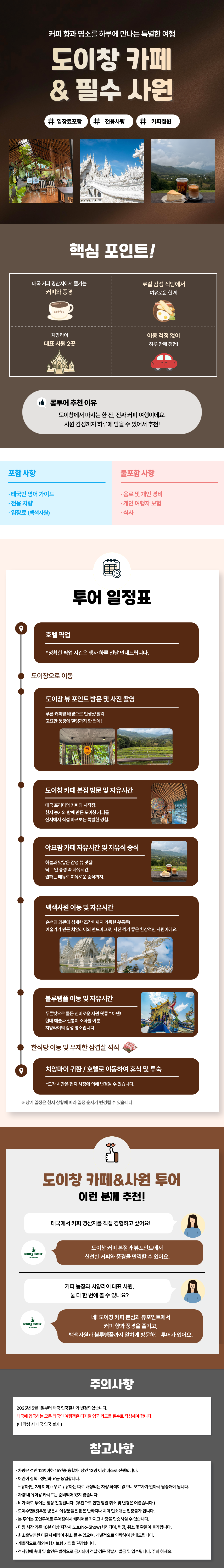 한 폭의 그림 같은 경치를 만나는 도이창 뷰 포인트와 태국 커피의 성지 도이창 카페 본점, 푸른 커피밭을 배경으로 식사를 즐길 수 있는 야요 팜 카페에서 특별한 여유를 만끽하세요. 이어 치앙라이의 대표 사원 백색사원(왓롱쿤)과 푸른빛으로 물든 블루템플까지 둘러보며 하루를 완성합니다.