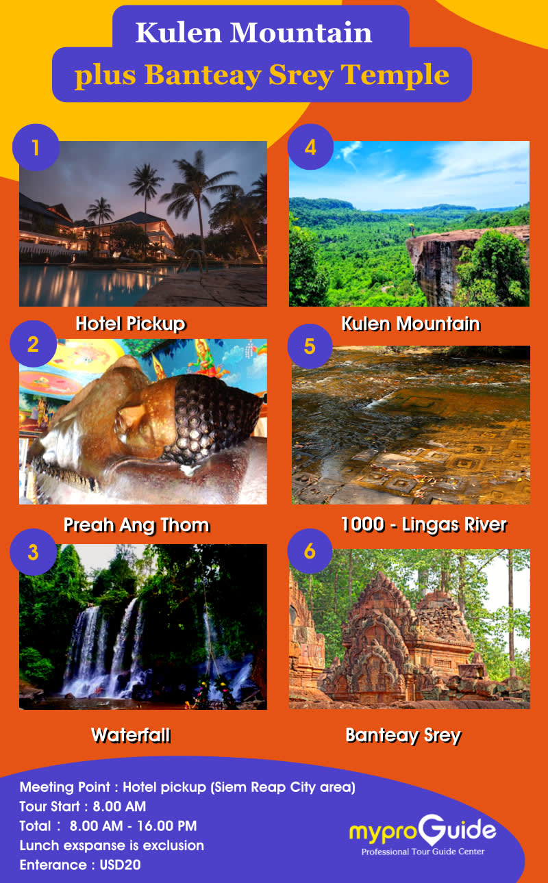 신성한 역사의 땅, 꿀렌산으로 떠나 잊지 못할 추억을 만들어보세요. 거대한 와불상이 있는 프레아 앙톰 사원에서 평온을 찾고, 시원하게 쏟아지는 꿀렌 폭포에서 상쾌함을 만끽해보세요. 신비로운 천 개의 링가 조각이 강바닥에 새겨진 모습을 감상하고, 섬세한 분홍색 사암 조각으로 유명한 반테아이 스레이 사원을 방문해보세요. 꿀렌산과 반테아이 스레이의 아름다움과 역사 속에서 특별한 하루를 보내고 호텔로 돌아오면 오랫동안 기억에 남을 감동과 여운을 느낄 수 있습니다.