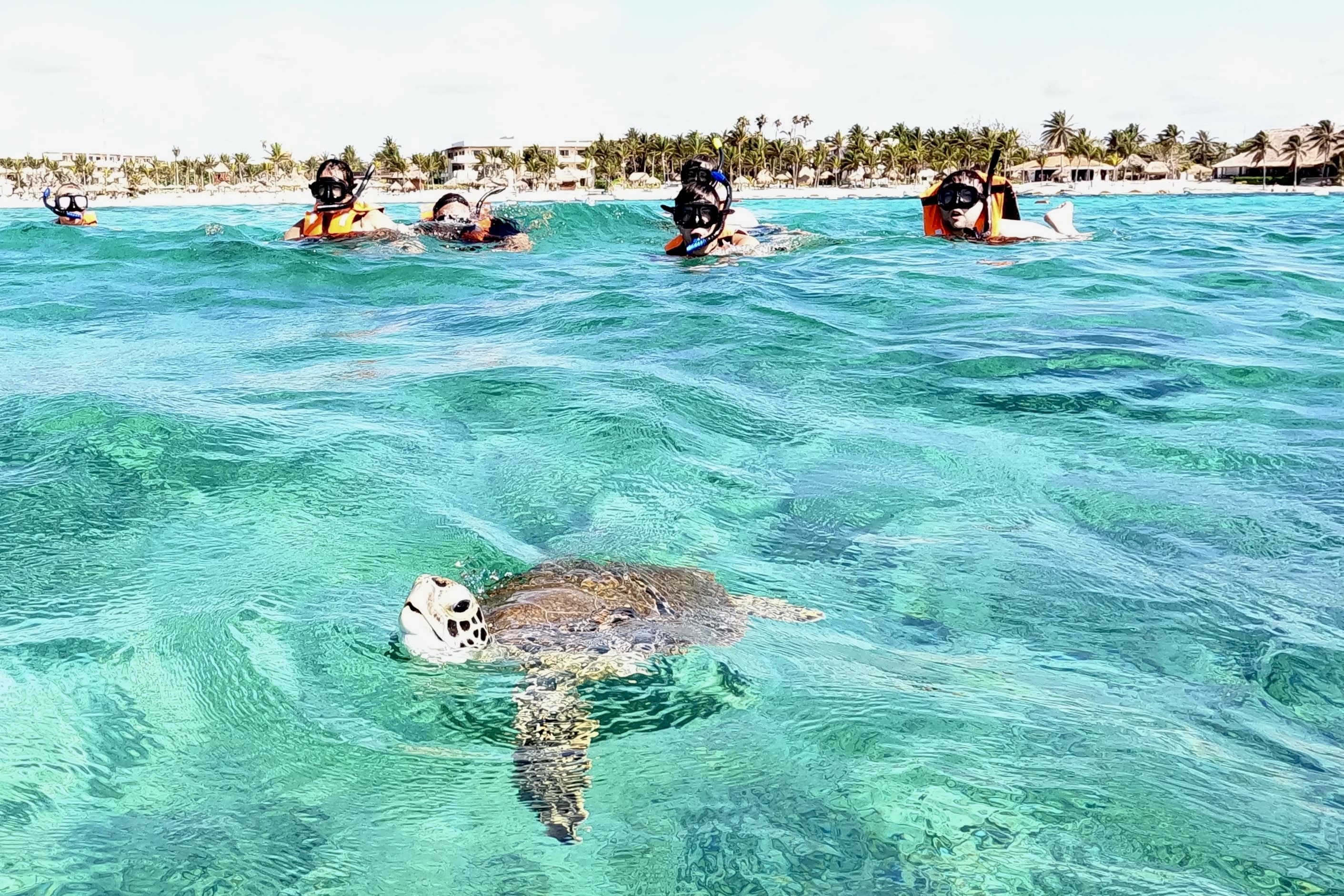 아쿠말과 놀라운 세노테를 탐험하면서 리비에라 마야와 유카탄의 아름다움을 즐겨보세요. 호텔에서 픽업하여 아쿠말의 스노클링 장소로 이동하여 자연 서식지에서 거북이와 가까이 수영할 수 있습니다. 따뜻하고 수정처럼 맑은 멕시코 카리브해에서 독특한 경험을 즐겨보세요.