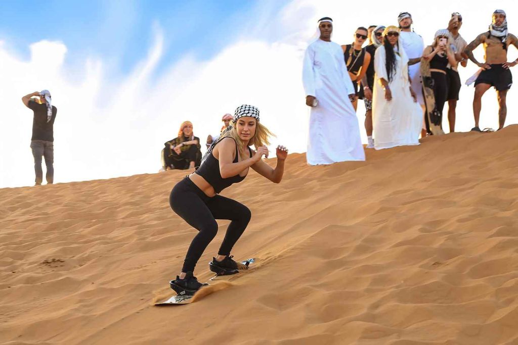 그런 다음 20~30분 동안 모험적인 듄 배싱을 즐긴 후 사막을 가로질러 사막 캠프에 도착합니다.