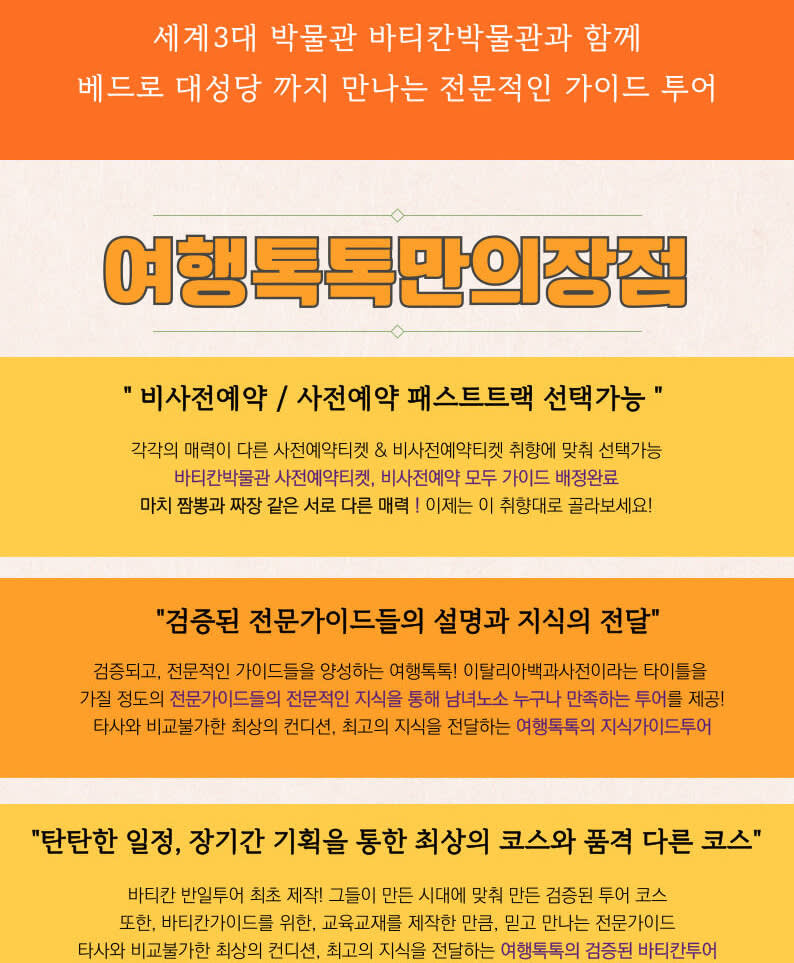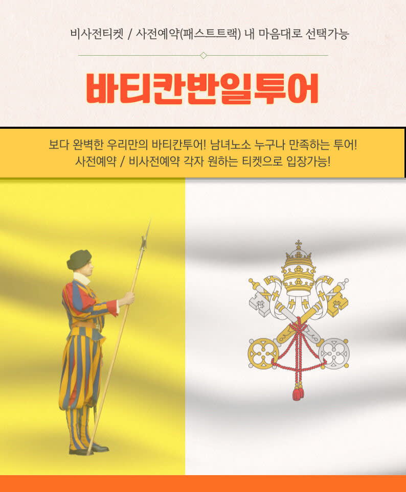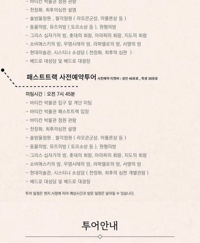 🙆 미팅 시간 : 오전 07:45 🙆♀️ 미팅 장소 : 바티칸박물관 앞 🙆♂️ 투어 코스 : 바티칸 박물관 ~ 시스티나성당 ~ 베드로 대성당 ✔️매주 일요일 바티칸 휴관일 - 투어 불가 ✔️예약 입장으로 진행되며, 티켓비는 성인 55 학생 45 ✔️예약&문의 전 필독 📌 사전예약(패스트트랙) 예약시 확정이 아닙니다! 잔여티켓 확인 후 패스트트랙(사전예약) 가능여부확인 후 안내드립니다. 📌패스트 트랙 대행사 티켓비용 : ✔️성인 55유로, 학생 45유로 + 수신기 1인 3유로