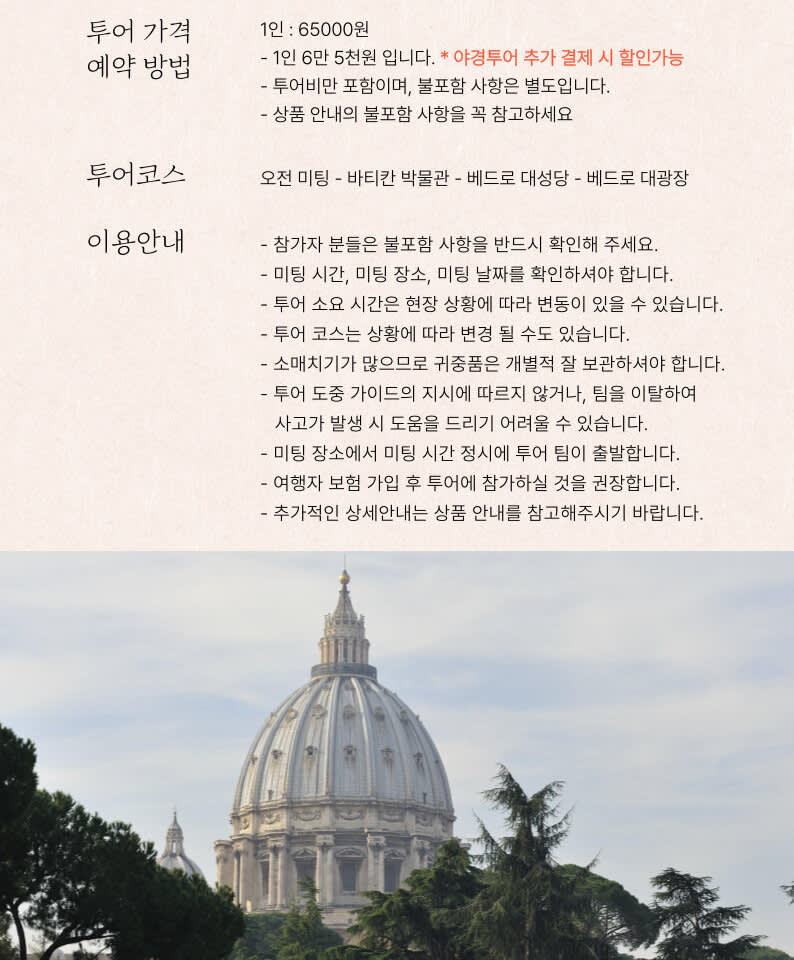 🙆 미팅 시간 : 오전 06:40 🙆♀️ 미팅 장소 : A선 ottaviano역 레몬글라스 🙆♂️ 투어 코스 : 바티칸 박물관 ~ 시스티나성당 ~ 베드로 대성당 ✔️비예약제 투어 진행 여행사 중 가장 늦은 미팅시간 ✔️매주 일요일 바티칸 휴관일- 투어 불가 ✔️비예약 입장 진행, 티켓비 성인 20유로, 학생 8유로 ( 1인 최소 20유로 이상의 대행사 수수료 없음 )