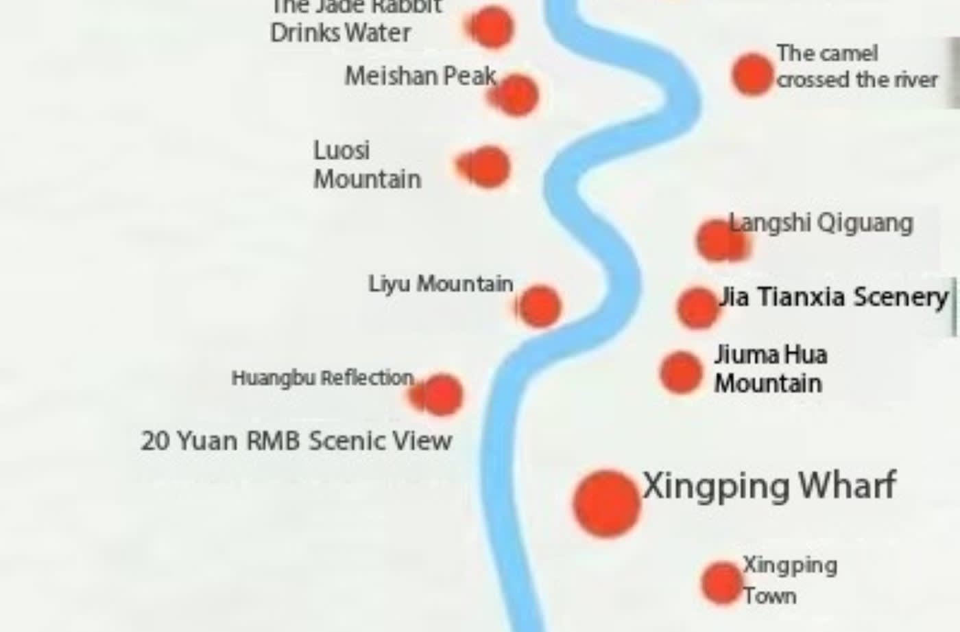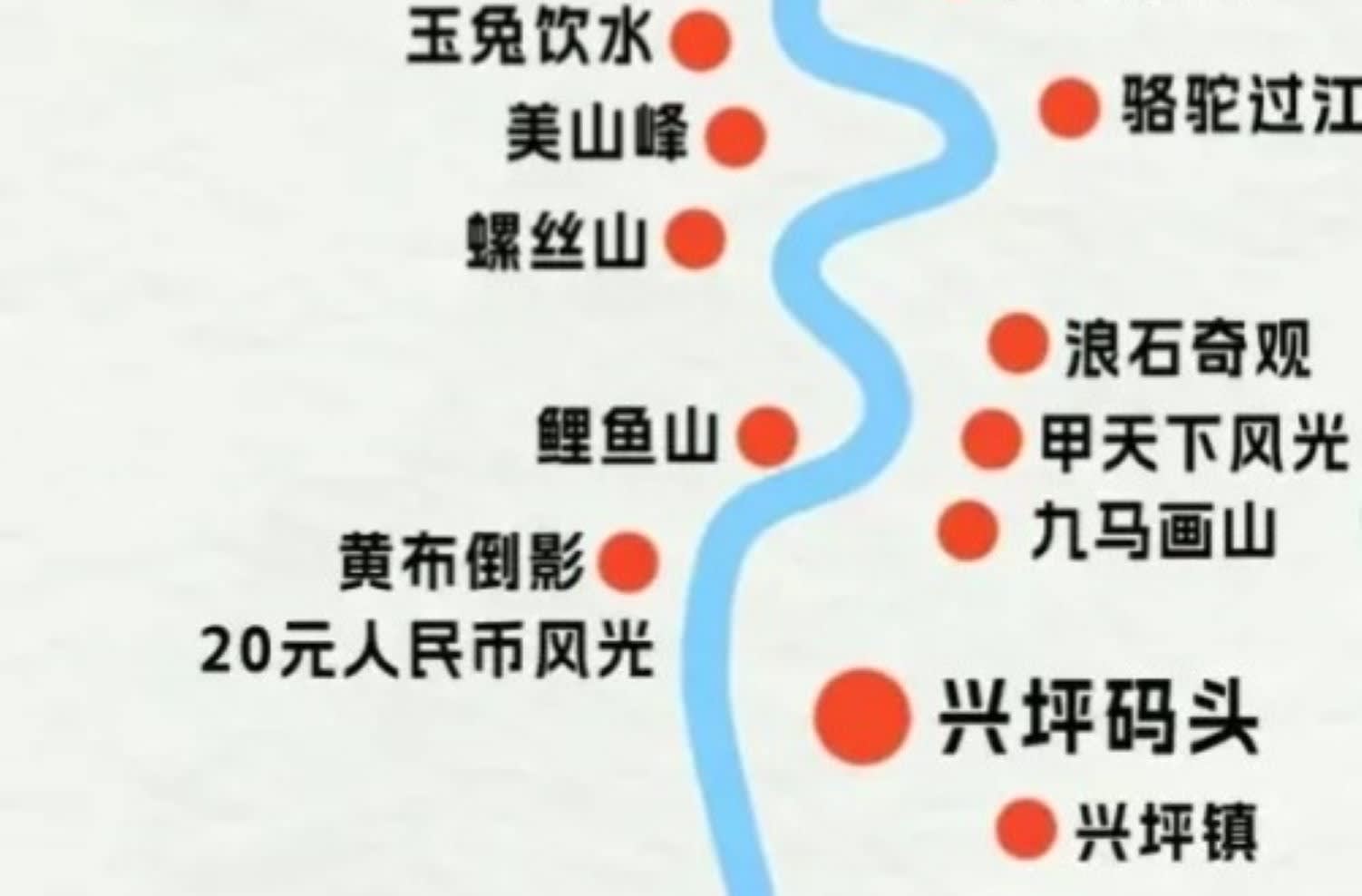 * ✨황포 도영(20위안 인민폐 풍경): 20위안 인민폐 배경의 촬영지, 강 수면이 잔잔할 때 산수 그림자가 매우 아름다움