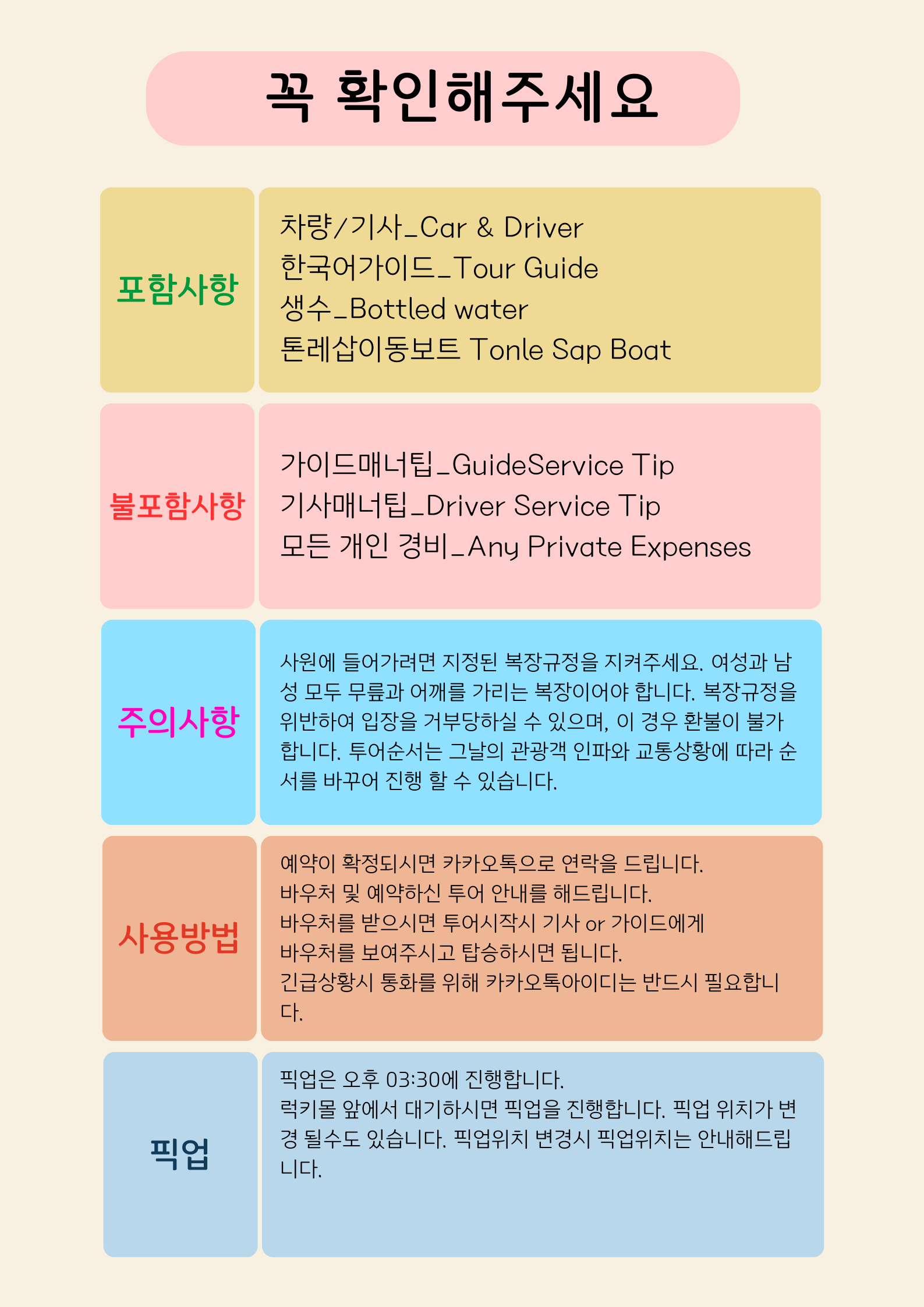 예약이 확정되시면 카카오톡으로 연락을 드립니다. 바우처 및 예약하신 투어 안내를 해드립니다. 바우처를 받으시면 투어시작시 기사 or 가이드에게 바우처를 보여주시고 탑승하시면 됩니다. 긴급상황시 통화를 위해 카카오톡아이디는 반드시필요합니다.